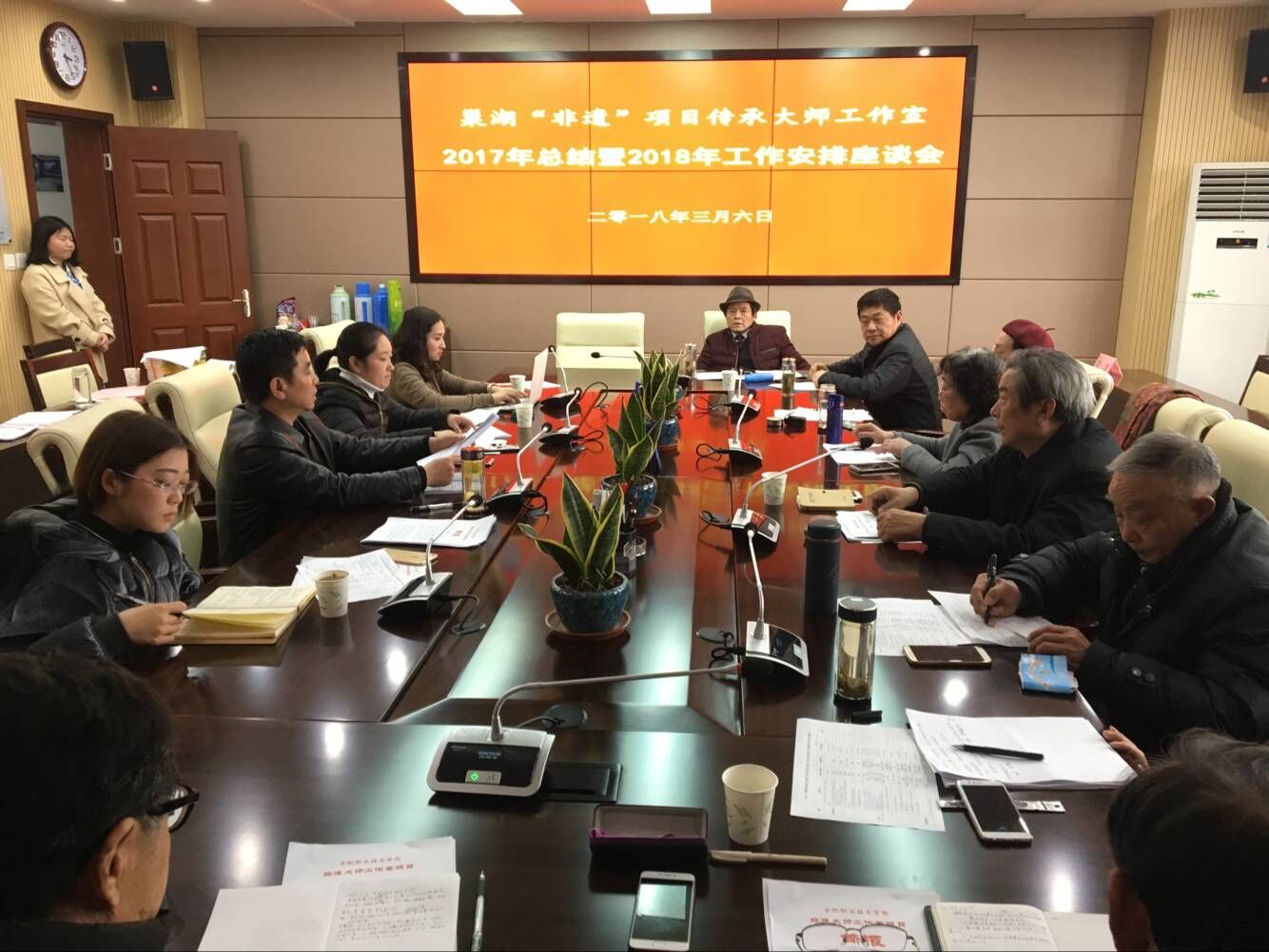 3月6日下午,Beat365巢湖非物质文化遗产项目传承大师工作室2017工作总结暨2018工作安排座谈会在学校行政楼3楼会议室召开。校党委副书记胡其云、巢湖民歌国家级传承人李家莲老师、“有巢氏”文化研究创始人宁业高研究员、巢湖市人大科教文卫工委会主任缪建华、巢湖民歌会会长蔡善康以及项目组校内外成员共同参加会议。