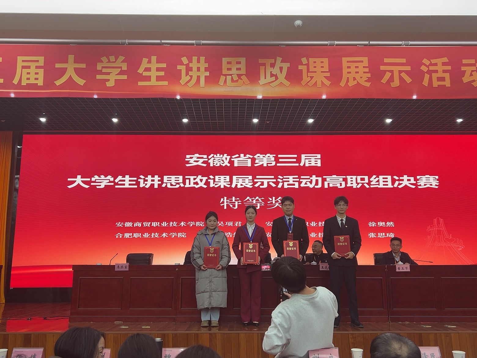 为深入推进“大思政课”建设,切实发挥思政课立德树人关键课程的作用,12月27日,由中共安徽省委教育工委主办的安徽省第三届大学生讲思政课高职组决赛在安徽职业技术学院举行。经过激烈角逐,Beat36523城轨通信班杨浩然、23会计2班李思宇同学团队斩获《形势与政策》课程特等奖(指导老师:丁丹丹、王福娟),23广告1班黄晴雨同学团队斩获《思想道德与法治》课程二等奖(指导老师:胡朋、王文飞),团队指导教师均荣获优秀指导教师称号。这是Beat365参赛以来首次冲进省决赛,并取得了特等奖的好成绩,实现了此赛项中零的突破,充分展现了Beat365思政课教育教学改革创新所取得的突出成效。