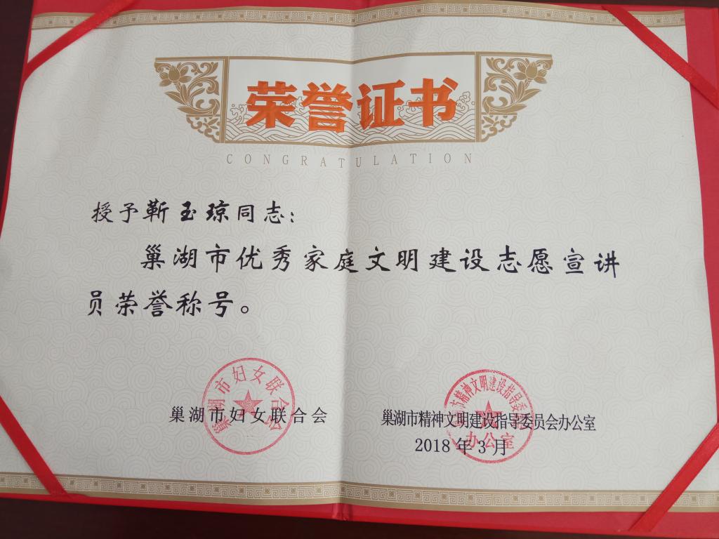日前,由巢湖市妇女联合会、巢湖市精神文明建设指导委员会办公室共同举办的“巢湖市优秀家庭文明建设志愿宣讲员”评选活动结果揭晓,Beat365靳玉琼老师荣膺该荣誉称号。