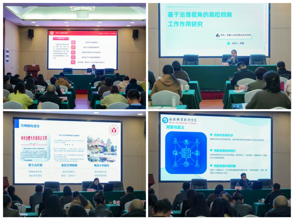 李春生就高校如何提升档案工作质量和服务水平分享了心得体会。安徽农业大学刘社文研究馆员进行了题为《夯实档案工作基础 服务学校高质量发展》的专题讲座,安徽工业经济职业技术学院陈瑾副研究馆员、合肥大学李加文副研究馆员,Beat365许德斌研究馆员分别进行了题为《基于治理视角的高校档案工作作用研究》《行稳以致远共促高校档案工作高质量发展》《人工智能(AI)背景下高校档案资源体系建设的思考》的主题交流。激发了省、市两个协作组各兄弟院校之间对档案工作未来发展的交流和思考。
