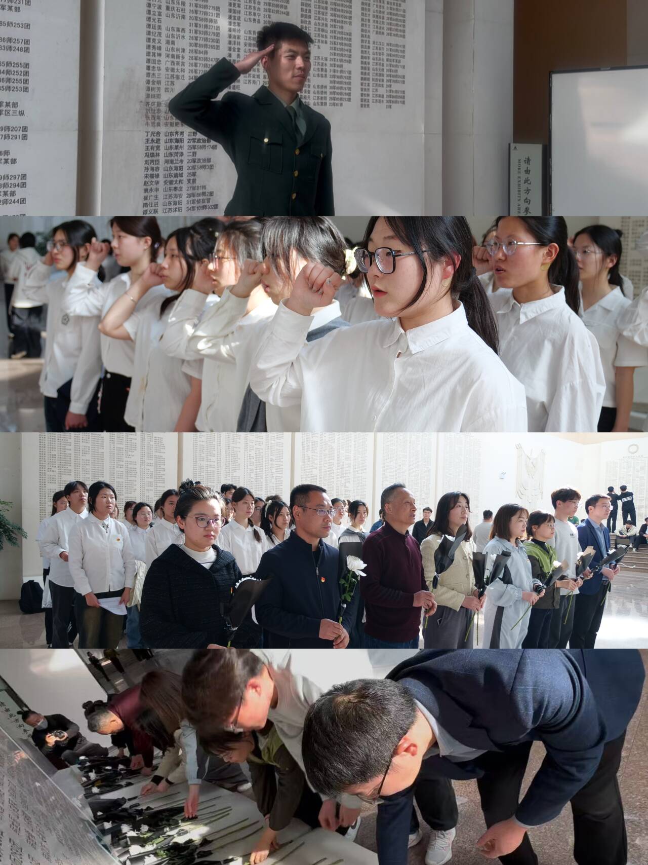 沉浸研学:时空对话、青春誓言。在沉浸式研学的过程中,同学们紧随讲解员的步伐,沉浸式重温那段波澜壮阔、改天换地的革命历史。驻足百万雄师过长江的巨幅浮雕前,冲锋号声仿佛穿透时空在耳畔回响;在刻满八千余烈士姓名的英烈墙前,退伍军人吕安奇以当代士兵的身份诵读《致先辈的一封信》:“这盛世如您所愿,强军战歌已在新时代奏响……”哽咽的声音激起阵阵共鸣。随后,全体师生怀着崇敬之情,在纪念碑前整齐列队,敬献鲜花,鞠躬默哀,向革命先烈致以无限哀思与崇高敬意。“我志愿加入中国共产主义青年团,坚决拥护中国共产党的领导……”全体青年团员面向英烈名录墙,庄严宣誓。铮铮誓言在现场久久回荡,彰显合职学子继承先烈遗志、勇担时代使命、投身强国伟业的坚定决心与磅礴力量。
