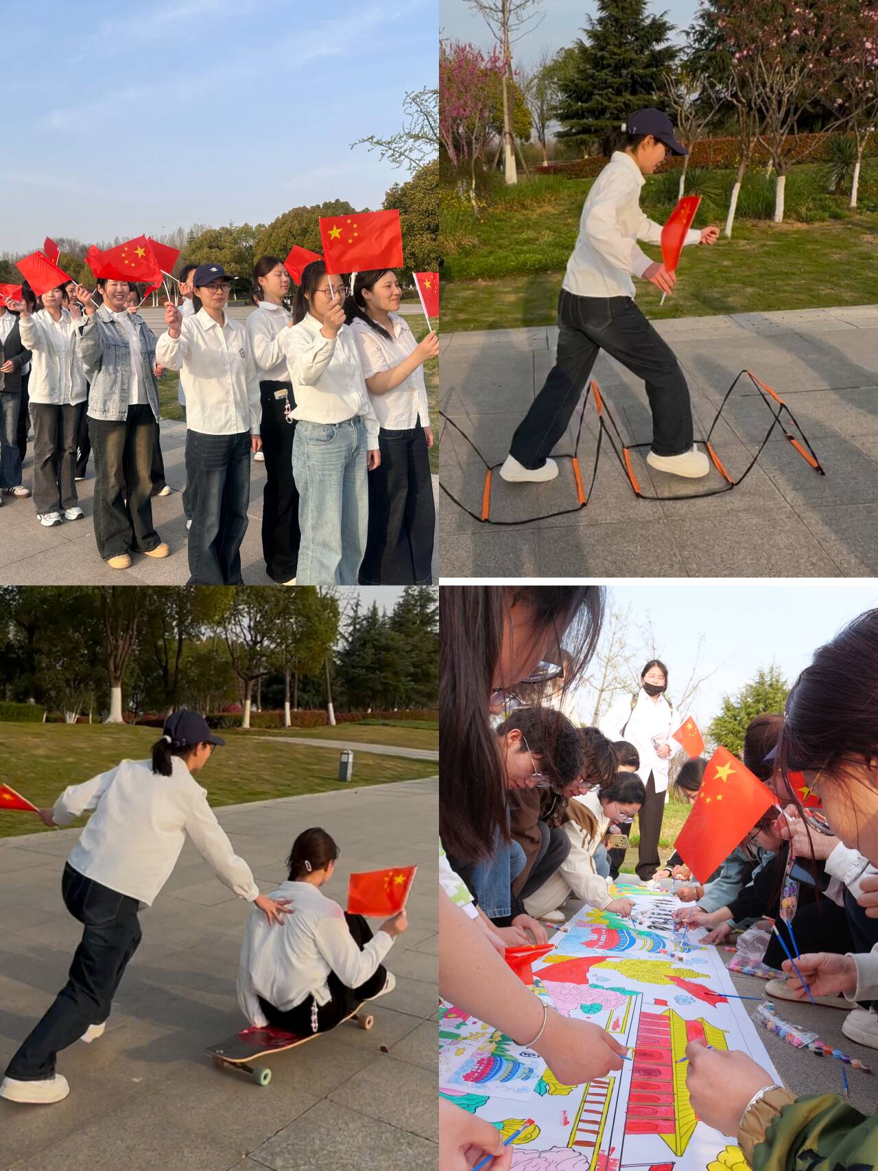薪火淬炼:薪火接力、共绘宏图。为激励青年学生实践的步伐,本次活动精益设计“红色接力”环节,同学们分组协作,依次挑战跨越障碍、模拟渡江、奋勇争先、共绘宏图等项目。当同学们完成接力后,拿起画笔,绘制“锦绣山河、热爱祖国”长画卷,一笔一划,一抹一彩,都融入了青年对祖国的无限热爱 ,绘就着属于他们的青春担当。