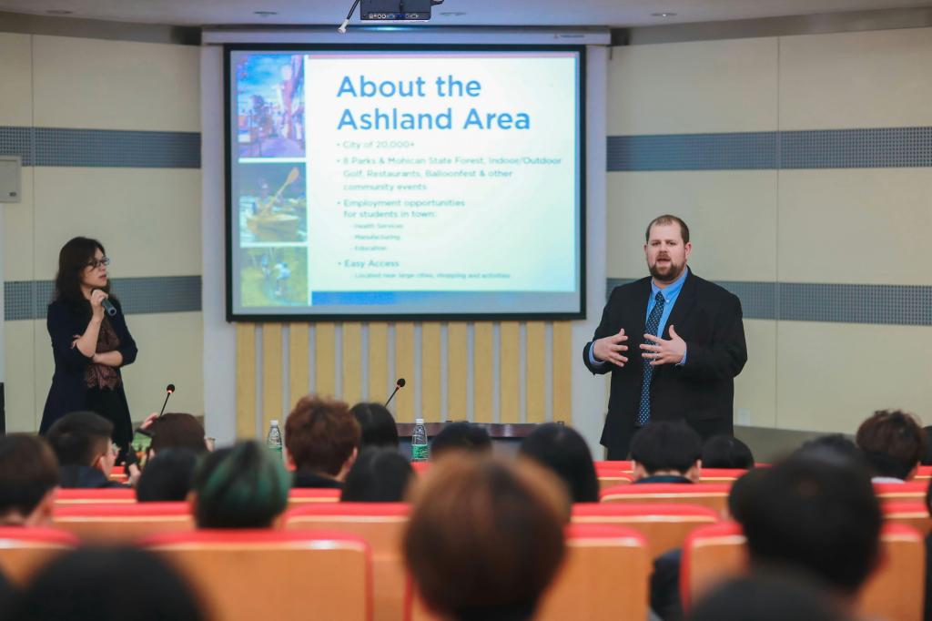 合作交流洽谈会结束后,Troy Miller一行在图书馆一楼第一报告厅举行学生交流会,用精彩的PPT展示了阿什兰大学的办学特色。经贸旅游学院、信息与电商传媒学院、生物工程学院、建筑工程学院等120余名学生参加交流会,通过此次交流会,同学们对出国留学有了更清晰的认识。