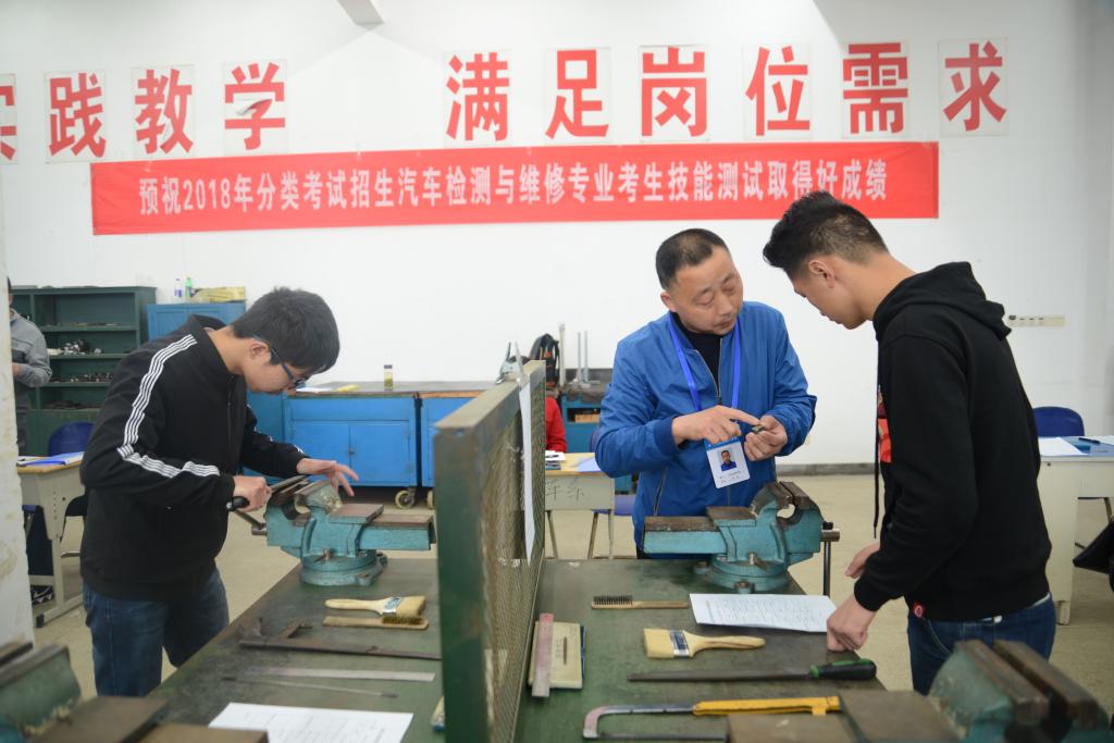汽车检测与维修专业职业技能测试在上午九点准时开始,主要考察考生的技能操作和基本功。测试过程中,8个组16个工位同时进行。监考老师们寸步不离地坚守在自己的岗位,考生也是聚精会神地进行操作。交通工程学院副院长杨光明告诉我们,为了扩大Beat365在人社部门和技工系统的知名度,Beat365安徽省汽车运输高级技工学校还在此次对口招生和分类招生考试期间组织了广泛宣传,此举可为大客专业提供更加优质的生源。