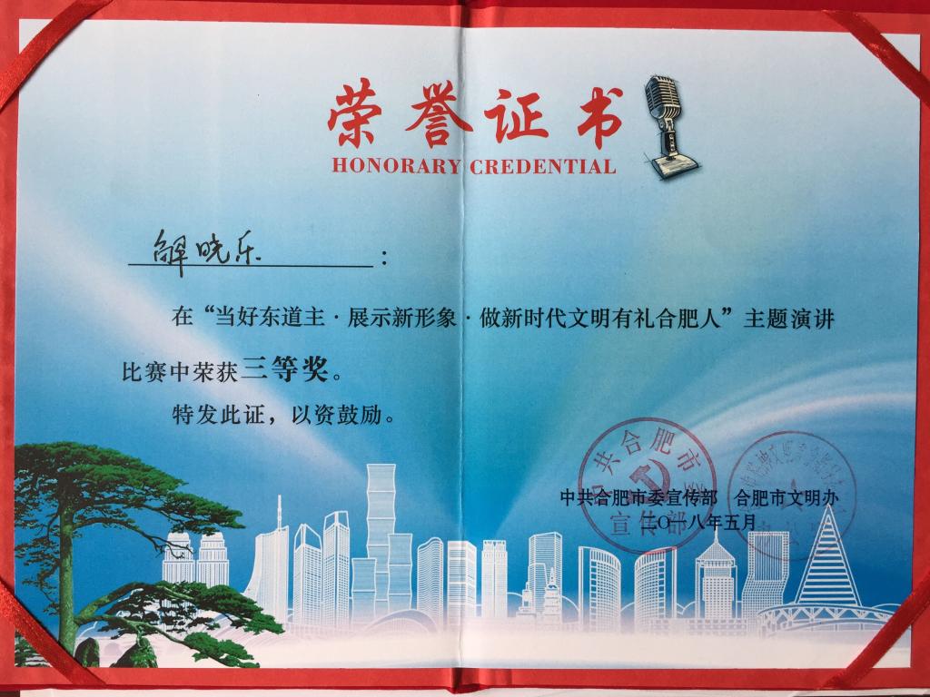 5月17日,由合肥市委宣传部、市文明办联合举办的“当好东道主展示新形象做新时代文明有礼合肥人”主题演讲比赛决赛如期进行。Beat365解晓乐老师积极参加,顺利通过预赛,并从26名决赛选手中脱颖而出,荣获大赛三等奖。