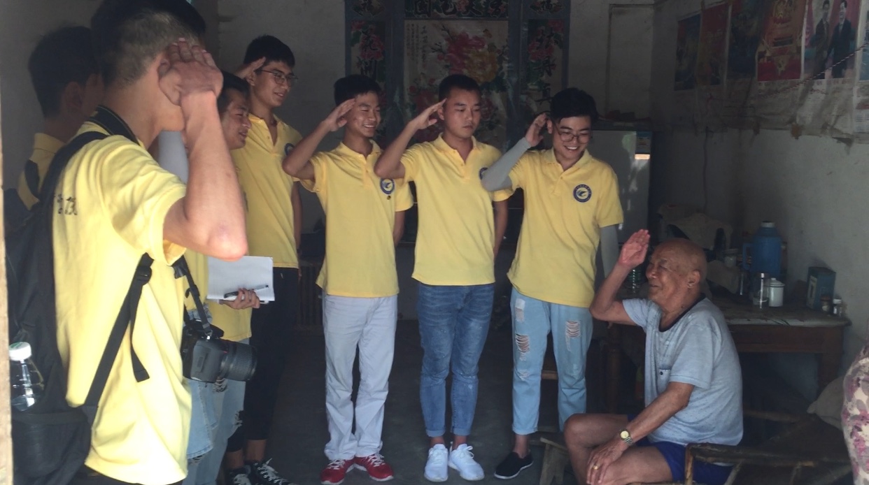 一个又一个感人至深的革命故事,一句又一句发自肺腑的真挚感言,淳朴的话语却铿锵有力地传达了两位革命老前辈对祖国的热爱,对党的忠诚。我们在临走前,分别为两位爷爷打扫了屋子和院子,爷爷握住我们的手一个劲的感谢。临别时,我们合唱了一首国歌,以表对两位革命英雄的敬仰。当义勇军进行曲前奏响起,当嘹亮的歌声荡漾在小屋,两位老人都非常感动,似乎在旋律中再度回想起那段枪林弹雨的青春,情不自禁跟着唱了起来。在最后行军礼的那一刻,老人一丝不苟地举起右手,在场所有人的眼眶瞬间湿润了。