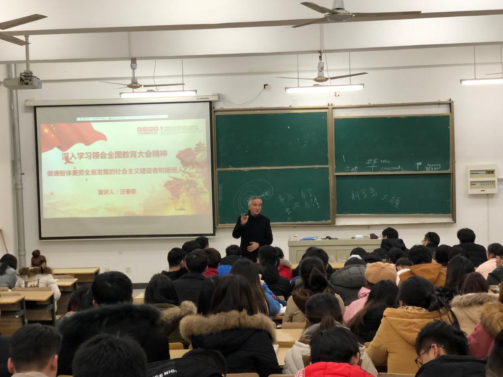 为深入学习贯彻落实全国教育大会精神,实现大会精神宣传全覆盖,12月10日至18日,汽车应用与轨道交通学院在巢湖鼓山校区和合肥汇心湖校区先后进行了七场以“深入学习领会全国教育大会精神”为主题的宣讲会,希望新时代的大学生们能够认真学习领会大会精神,积极进取,刻苦学习,乘着改革开放的东风成为中国特色社会主义的建设者和接班人,为中华民族伟大复兴中国梦的实现挥洒自己的青春热血。宣讲会分别由学校教务处处长宋风长、该院党总支书记汪春荣、该院副院长(主持工作)解云、马克思主义学院党总支副书记、副院长靳玉琼等主讲,该院在校的2016-2018级全体学生及专兼职辅导员参加了宣讲会。