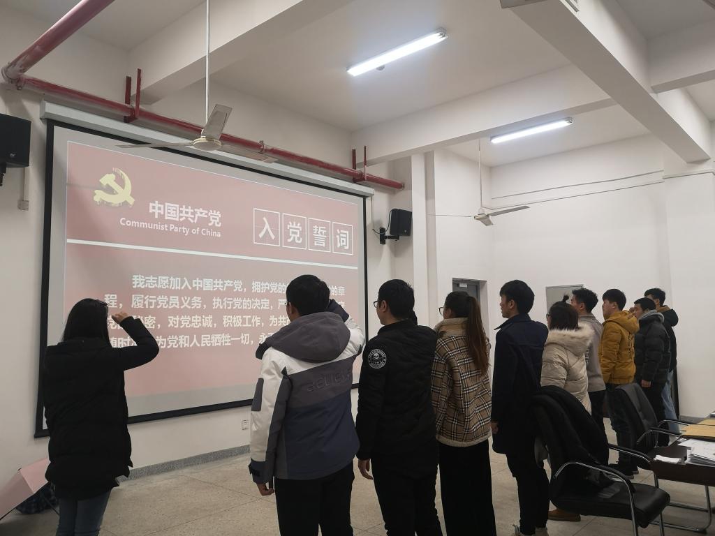 会议最后,徐婧婧老师带领预备党员们宣读入党誓词,大家排成一排,手握拳头,举至头顶,用着铿锵有力的声音念着誓词,高亢激昂的声音久久回荡在会议室。(供稿:机电工程学院 编辑:朱鹏飞)