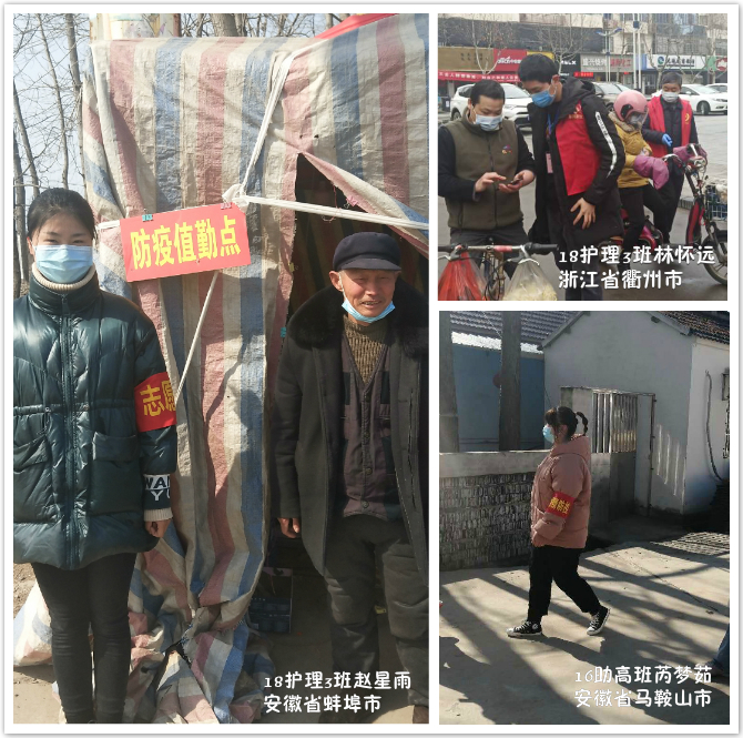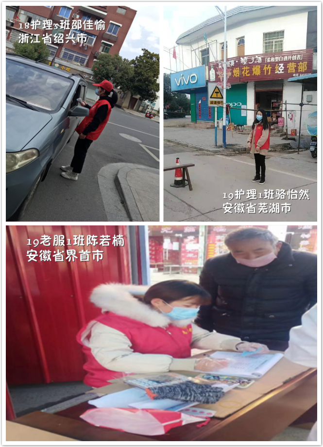 在该院一线的“最美逆行者”和前期学生志愿者的榜样精神引领下,又有一大批学生志愿者们加入抗击疫情这个队伍。他们中有在社区参加防疫工作的,比如加入社区“雷锋志愿服务团队”的赵星雨(18护理3班),还有芮梦茹(16助高班)、林怀远(18护理3班)、邵佳愉(18护理5班)、吴亚男同学(19护理13班)。在社区给过往行人测量体温、核实身份、统计社区出入人员数量、下乡宣传,口罩挡住了他们青春的面孔,却挡不住他们战胜疫情的决心和坚毅,他们在为打赢这场艰难的抗疫战积蓄力量。