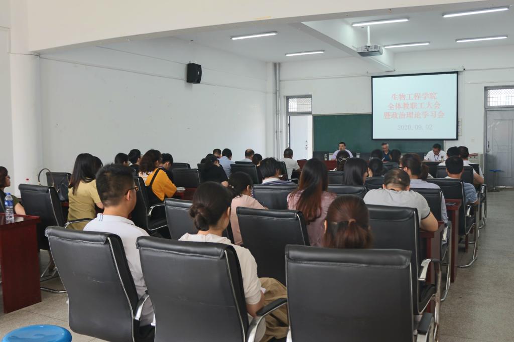 9月2日上午,生物工程学院在生化楼A305会议室召开全体教职工大会暨政治理论学习会。会议由生物工程学院方丽波主任主持,学院全体教职工参会。