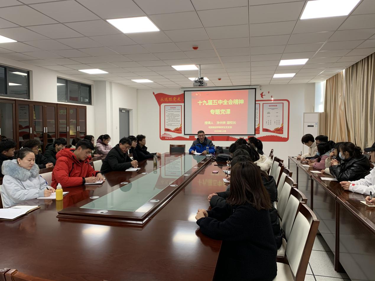 为深入学习党的十九届五中全会精神,深刻理解新时代青年大学生的使命和担当,提高广大师生党员的党性修养,12月15日下午,副校长孙兴林到经贸旅游学院学生党支部作题为《深刻认识党的十九届五中全会精神的重大意义,承担起新时代的使命和担当》的专题党课。经贸旅游学院学生党支部全体在校师生党员和部分入党积极分子参加了本次党课学习,会议由经贸旅游学院党总支书记梅亚松主持。