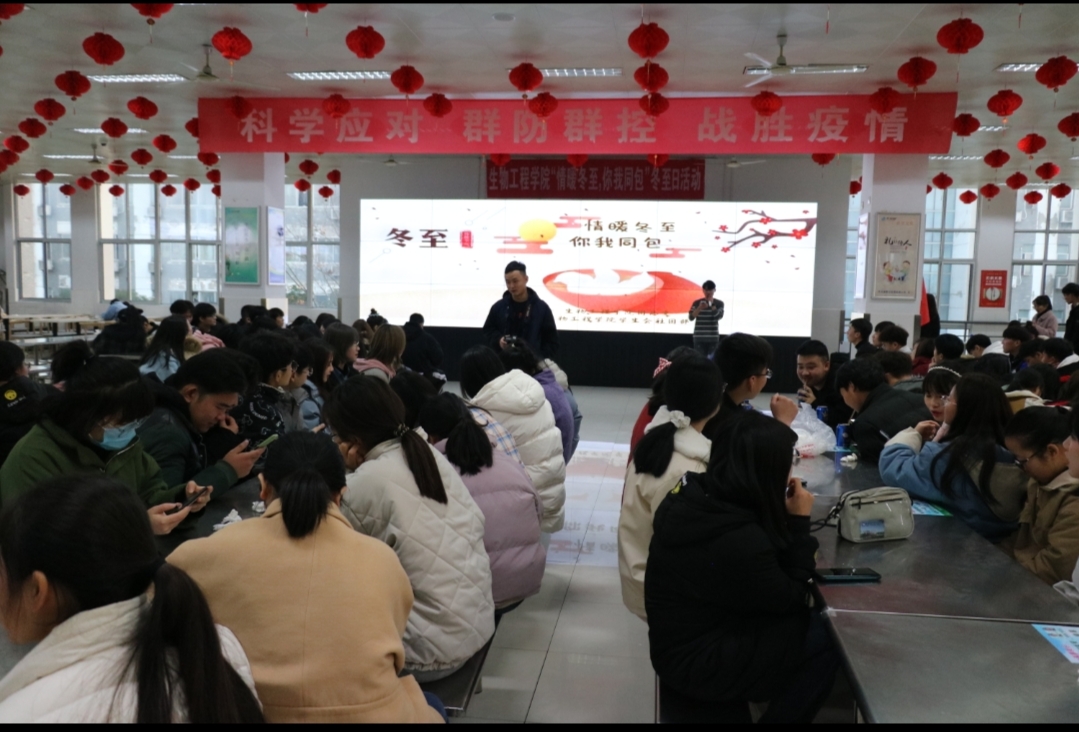 今年12月21日是我国的传统节日——冬至。为了让同学们感受到节日氛围,增进同学们之间的感情,又能感受到自己动手包饺子的乐趣,生物工程学院在冬至日当天组织了一次别开生面的包饺子活动。此次活动的主题是:“情暖冬至,你我同包”。