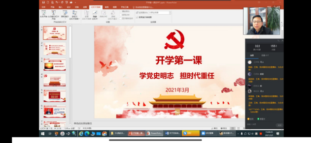 学校组织部部长王海、学院党总支书记佘海月在3月5日通过钉钉直播给同学们上了《开学第一课——学党史明志 担时代重任》。