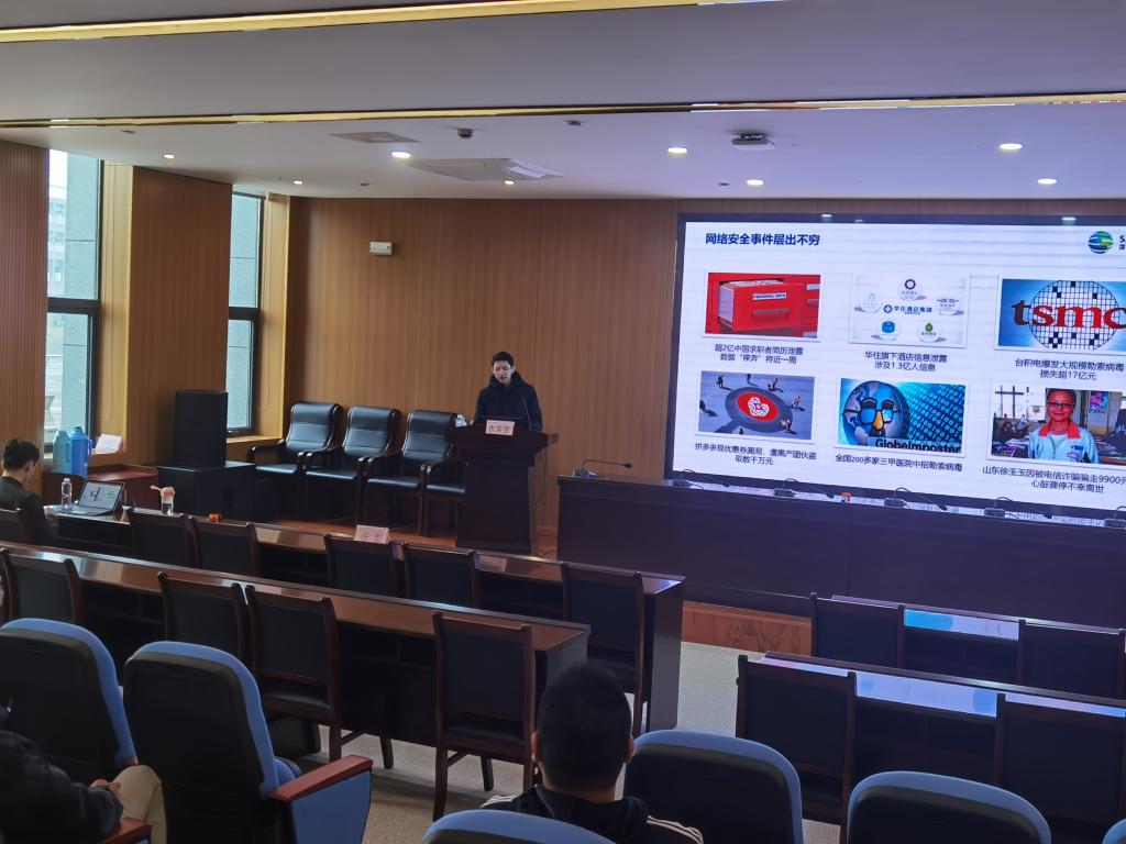首先,由农荣斐工程师作《安全意识筑牢网络安全防线》的宣讲,分别从网络安全的外部环境,身边的网络安全陷阱,威胁来自什么地方,该如何做等几方面给网络安全知识做了深度解读,讲解中通过列举大量信息安全事例,让我们体会到树立信息安全意识至关重要。