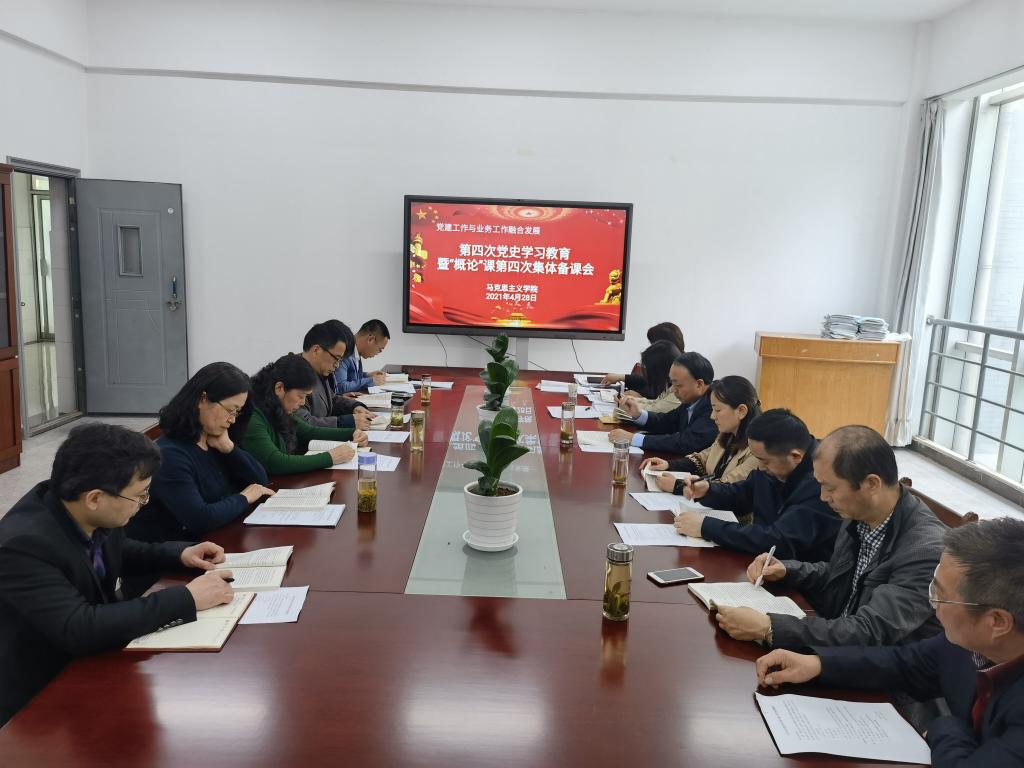 为深入贯彻习近平新时代中国特色社会主义思想,持续推进习近平新时代中国特色社会主义思想进教材进课堂进头脑,全面落实习近平总书记在党史学习教育动员大会上的重要讲话精神,把党史学习教育融入高校思想政治理论课育人全过程,真正做到学史明理、学史增信、学史崇德、学史力行,4月28日,马克思主义学院组织开展党史学习教育暨《毛泽东思想与中国特色社会主义理论体系概论》集体备课会,推进党史学习教育“进课堂”。全体专职思政课教师和部分兼职教师代表参加会议。集体备课会由马克思主义学院院长靳玉琼主持。