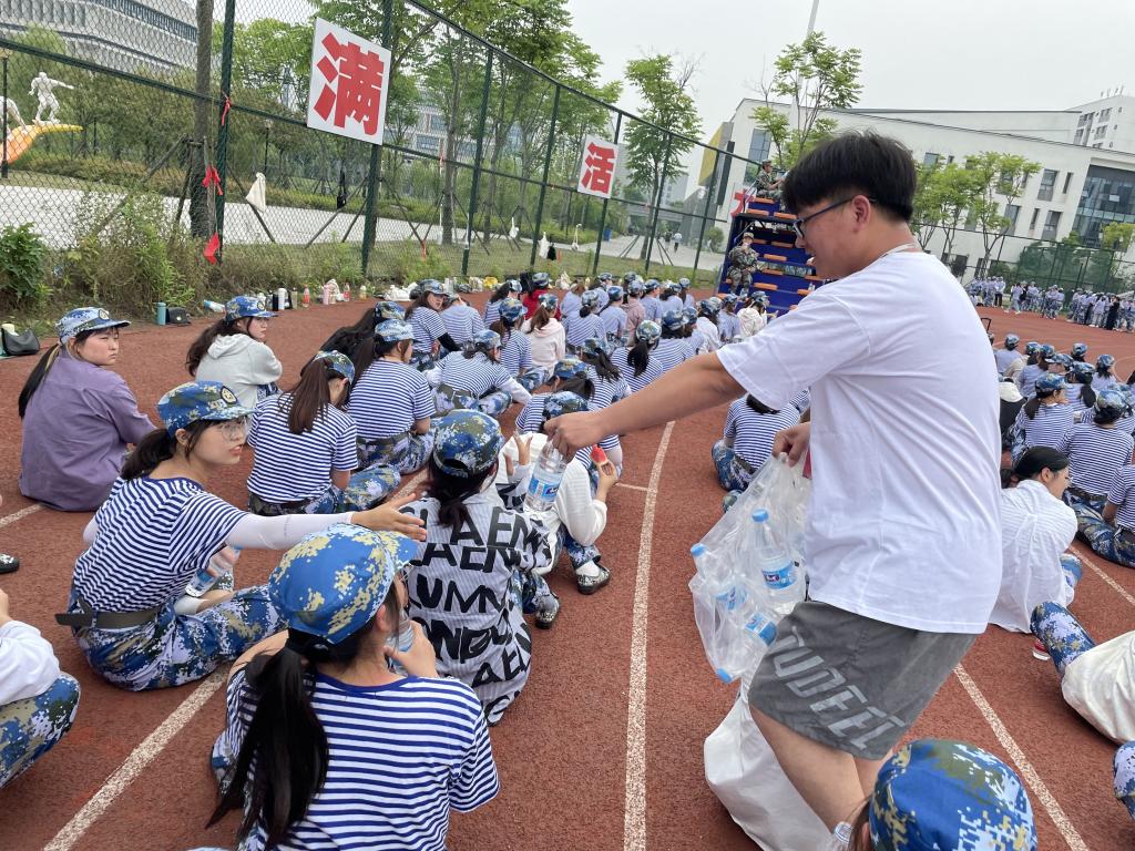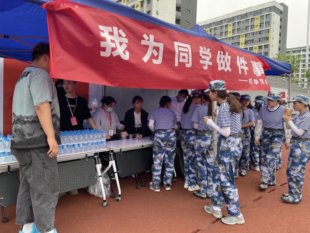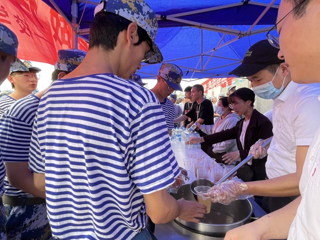 到达训练场地后,在短暂的军训休息时间里,校学生会志愿者们将水、绿豆汤等各类防暑降温的饮料送到了参训新生的手中,以消减他们军训后的疲惫。志愿者们和食堂员工分工明确,新生们也有秩序地排队领取,不一会儿,每一位新生都喝上了解暑的饮品,收获了一份专属的夏日清凉。
