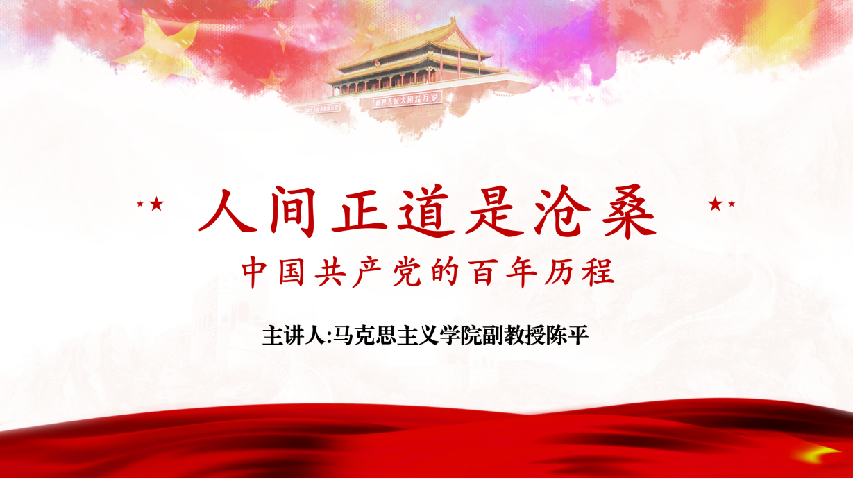 此次专题讲座由马克思主义学院副教授陈平老师讲授。本次讲座主要分为五个部分,第一部分“时代的召唤”主要从科学理论、领导集体以及解决的现实问题三方面,论述出中国共产党是历史和人民所选择的;第二部分和第三部分分别从“百年奋斗历程”、“百年辉煌业绩”两方面,向大家简述党的奋斗历史,描绘出党在百年间领导的新民主主义革命、社会主义革命以及改革开放的丰功业绩;第四部分“百年成功密码”,陈平老师带领同学们总结之前所学内容,并不断深入探寻最终得出坚持中国共产党的领导是“定海神针”、掌握马克思主义理论是“制胜法宝”、扎根中国实际是“必由之路”、密切联系群众是最大的政治优势、勇于自我更新是“灭菌剂”等方面是中国共产党成功的原因;最后以“把握历史大势”为第五部分作为讲座的结尾,中华民族距离伟大复兴的目标从未如此之近,广大青年生逢其时,也重任在肩。