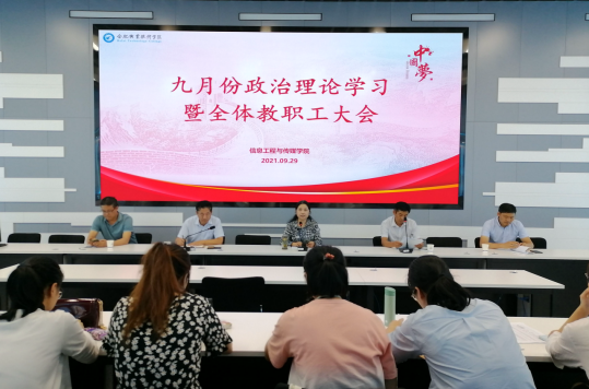 9月29日下午,信息工程与传媒学院在轨道楼四楼网络安全实训中心召开九月份政治理论学习暨全体教职工大会,会议由院党总支书记李红雨主持,学院全体教职工参加会议。