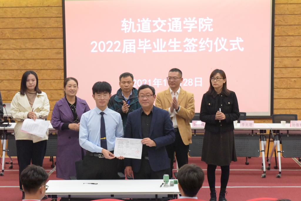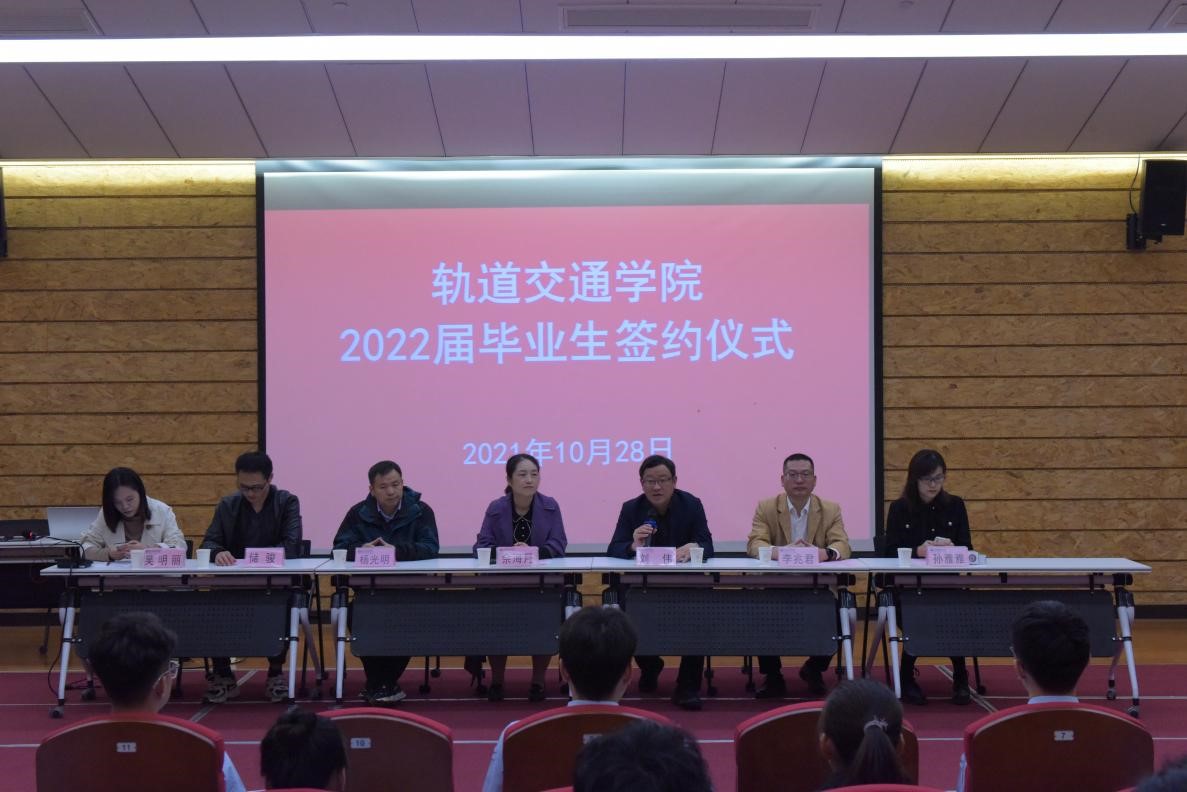 10月28日上午,轨道交通学院举行2022届毕业生就业协议书签订仪式。滁宁城市铁路开发建设有限公司副总经理刘伟、轨道交通学院党总支书记佘海月、轨道交通学院副院长杨光明(主持工作)等出席签约协议。仪式由轨道交通学院团总支书记吴明丽主持。