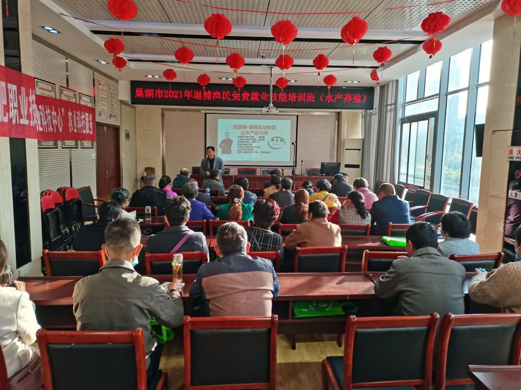 散兵镇与中庙镇村民往年依靠巢湖水产资源以捕鱼为生,自巢湖市发布“十年禁渔”政策以来,村民们失去了生活来源,当地政府为解决村民的经济问题,举办了“退捕渔民免费就业培训班”,郑学斌副教授为培训班学员进行农业技术培训。郑学斌副教授从如何转变农业产业理念开始,倡议学员们要解放思想,开拓视野,学习现代农业新知识、新技能,寻找农业生产新方向;从水产养殖、家畜养殖等方面,向学员传授养殖知识和生态养殖的理念。同时,郑学斌副教授给学员们详细讲授“互联网+”营销理念如何与农业相结合,如何做到既能生产出好的农产品,又能销售的出去。