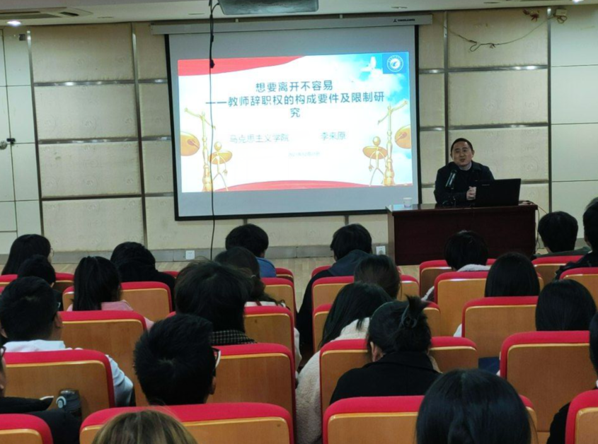 为更好地落实和推动习近平法治思想进校园、进课堂,提高师生的法律意识与水平,更好地做到知法、懂法、守法、用法,12月1日下午,马克思主义学院在鼓山校区图书馆二楼报告厅组织了一场法律知识学术讲座。本次讲座主题为《想要离开不容易——教师辞职权的构成要件及限制研究》,由马克思主义学院李来原副教授主讲。学校部分师生现场参加了此次报告会。同时,报告会在学校钉钉群内进行了同步直播。