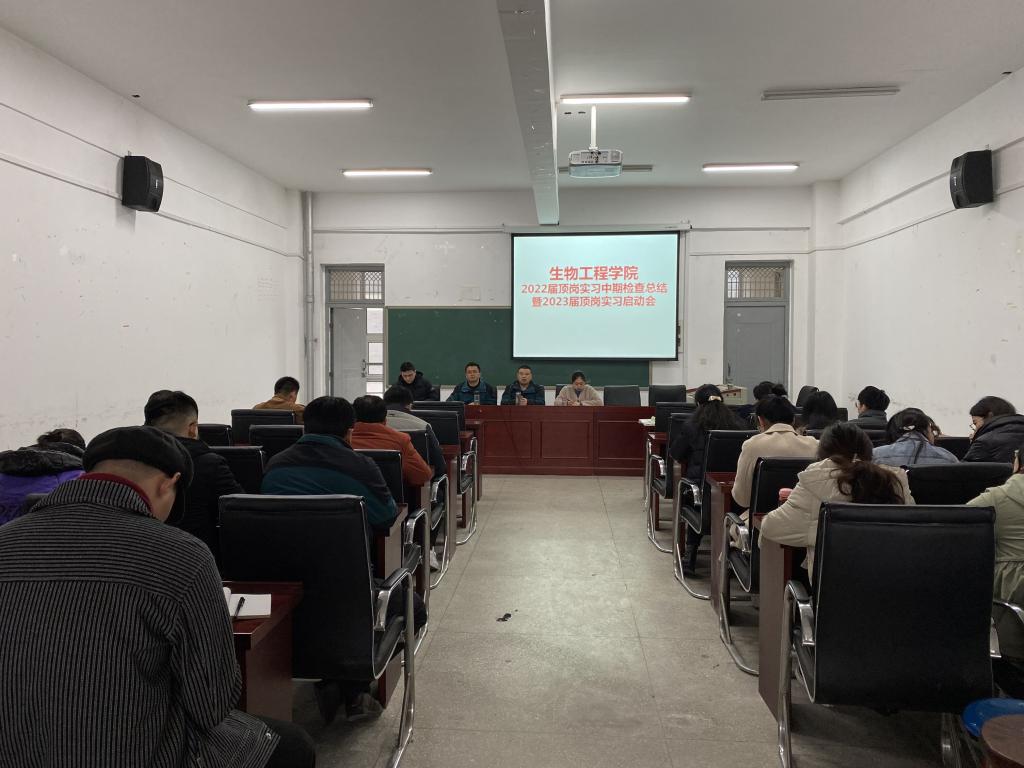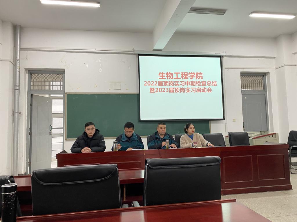 为及时发现和总结实习中期检查过程中的问题及改进措施,做好2023届毕业生的顶岗实习工作,落实校企合作,确保顶岗实习取得良好效果,生物工程学院于12月15日下午在生化楼A305召开2022届顶岗实习中期检查总结暨2023届顶岗实习启动会。会议由生物工程学院院长刘修树主持,出席会议的有生物工程学院副书记兼学管办主任周婷、副院长方丽波、王文宇、全体2022届实习老师及全体2023届毕业生班主任。