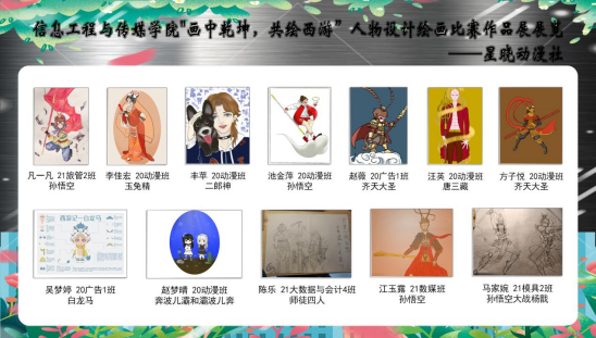 为了弘扬和传承中国优秀传统文化,信息工程与传媒学院星晓动漫社于12月2日至12月8日举办了“画中乾坤,共绘西游”人物形象设计绘画比赛。