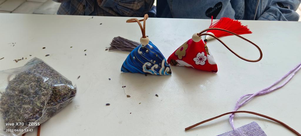 活动开始前,志愿者便早早地准备好了桌椅和香包材料,随着同学们的到来,活动也拉开帷幕。大家都坐在座椅上,志愿者一边为大家发放香包的材料和制作工具,一边为大家讲解清明的传统习俗和制作香包的意义。同学们拿到材料后,纷纷穿针引线,认真细心地缝制着属于自己的香包。“针脚怎么缝制?”“收口怎么收?”“缝合的时候针脚一定要密,不然线头会露出来的。”志愿者们热情地为大家解决缝制中出现的问题。很快,大家就到了香包的封口工作了,大家拿着自己喜欢的香料填充在香包里,空气中弥漫着淡淡的青草香。