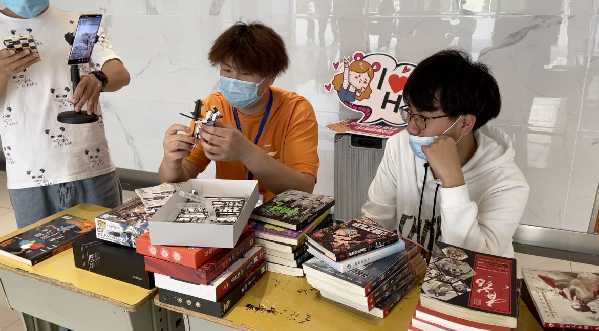 活动现场,志愿者们根据疫情防控要求,积极维护秩序,做好测量登记,引导“主播”有序入场,做好间隔。各个“主播”摊位物品丰富,有课外书、手办、发卡等等各类商品。主播们在自己的直播间卖力介绍好物,直播间热情高涨,弹幕源源不断,互动频繁。