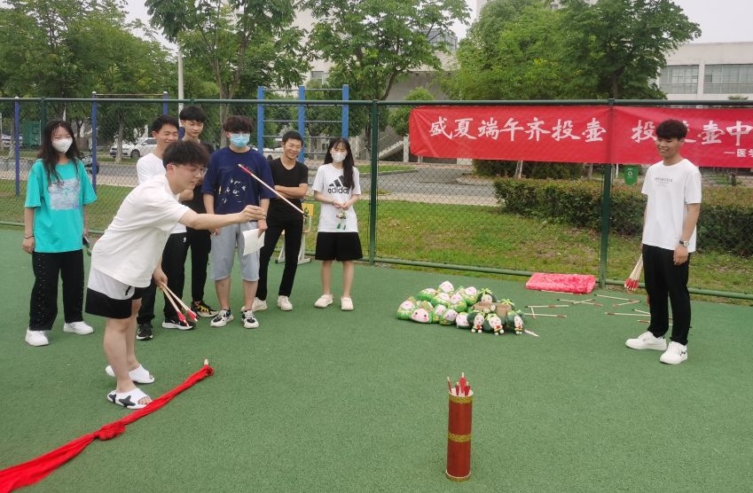 粽叶飘香迎端午,投中壶中相思情,“趣味投壶”活动在田径运动场吸引大量学生的热情参与和围观。同学们踊跃参加,积极尝试,现场气氛热烈。男女生参赛队员各显身手,操场上不断传来大家的欢笑声,接连不断的叫好声、喝彩声回荡在整个场地,随着同学们的精彩表现,活动现场的气氛出现一个又一个的高潮。