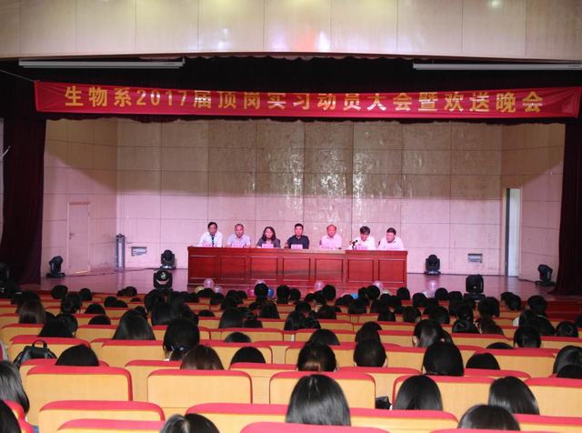 5月19日下午,生物系在大学生活动中心召开2017届学生顶岗实习动员大会,党委副书记胡其云、副院长周晓隆和院实验实训中心、招就处、生物系等部门负责人出席大会,会议由生物系党总支书记宁业群主持。