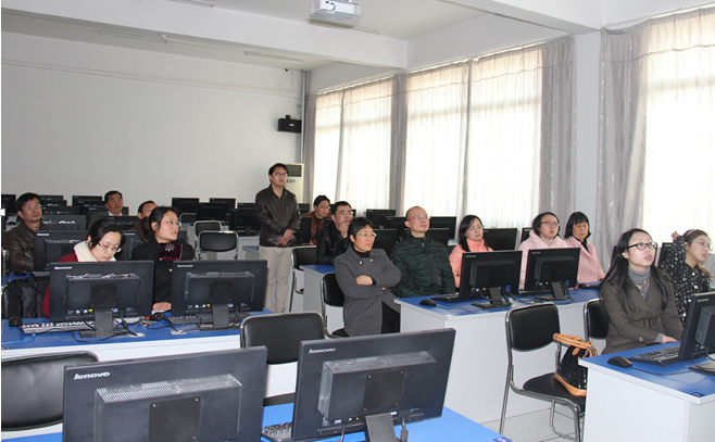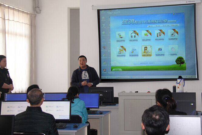 讲座在综合实验楼四楼机房进行,教务处、实验实训中心及外语教研室相关负责人和老师均在现场认真听讲,对语言教学中云技术运用情况进行详细了解。讲座结束后,参会人员和蓝鸽集团就我院语音室建设、云技术运用等方面进行了充分交流和技术咨询。