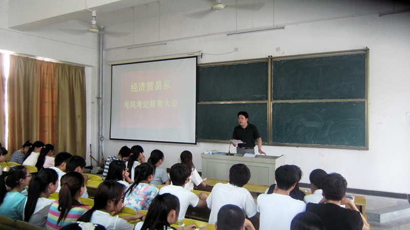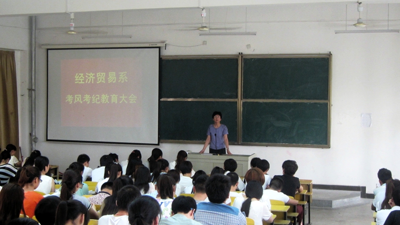 经贸系党总支书记王秀珍在会上就考风考纪问题从三个方面作了讲话。一是为什么要抓考风考纪。王秀珍书记说,抓好考风考纪是规范教学管理,推进整改的重要内容;是呼唤教育公平,促使良好学风形成的重要环节;是培养大学生诚实守信的品质,保证人才培养质量的途径和步骤。二是为什么会有作弊现象。究其原因主要是缺乏自信、担心补考、为了拿奖学金以及从众心理。希望同学们对照自我,认真分析并作出正确抉择。三是如何抓好考风考纪。对此学院专门下发了《关于进一步加强考风考纪教育工作的通知》,经贸系也制订了具体实施办法,通过多种形式多种途径进行通过宣传教育引导,帮助同学们正确认识和对待考试,做到诚实守信不作弊;同时对违纪同学将严格按照学生手册规定进行处罚。召开全体学生干部大会就是表明考风考纪要从学生干部抓起,希望全体学生干部以身作则,发挥模范带头作用,一方面在同学中做好考风考纪教育宣传工作,对考风考纪态度鲜明,立场坚定;另一方面要经得住考验,不仅自己不作弊,不协助他人作弊,同时要在思想上和行动上坚决抵制作弊,要在同学们当中义正词严的反对考试作弊,让刻苦学习,诚信考试成为学校的主流。