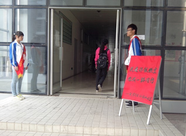 每天早上7:20~7:55,院学生会干部、环保协会会员按照值班表,轮流到各教学楼入口处开展劝导活动,劝说同学们不要将早点带入教室。