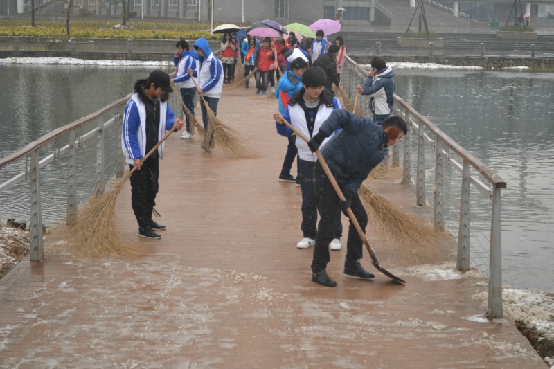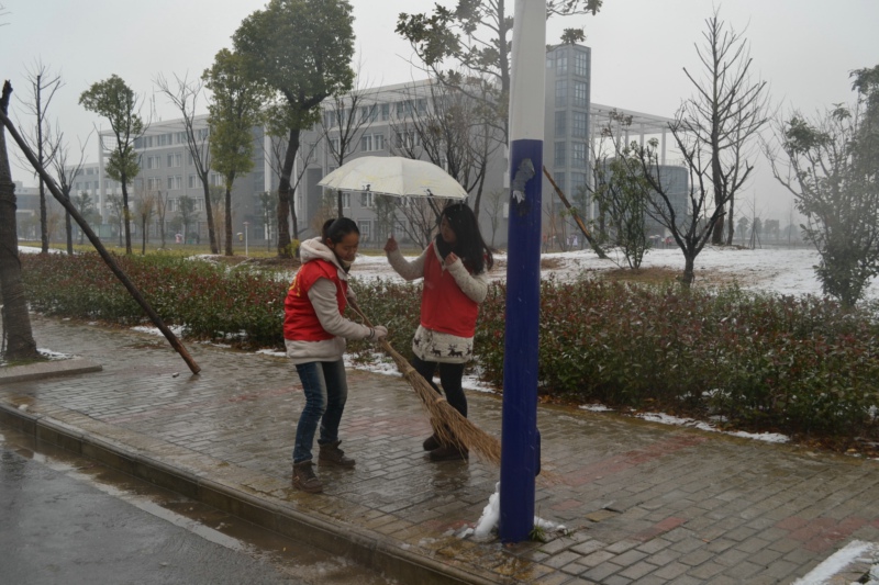 志愿者们互相配合,毫不畏惧,虽然天气寒冷,大家的脸和手都冻僵了,但是,看着地上的积雪一点一点的减少,地面一点一点的显露出来,大家都露出了开心的笑脸,在大家的共同努力下,校园内的积雪终于被清理完毕,洁净的路面呈现在人们眼前。