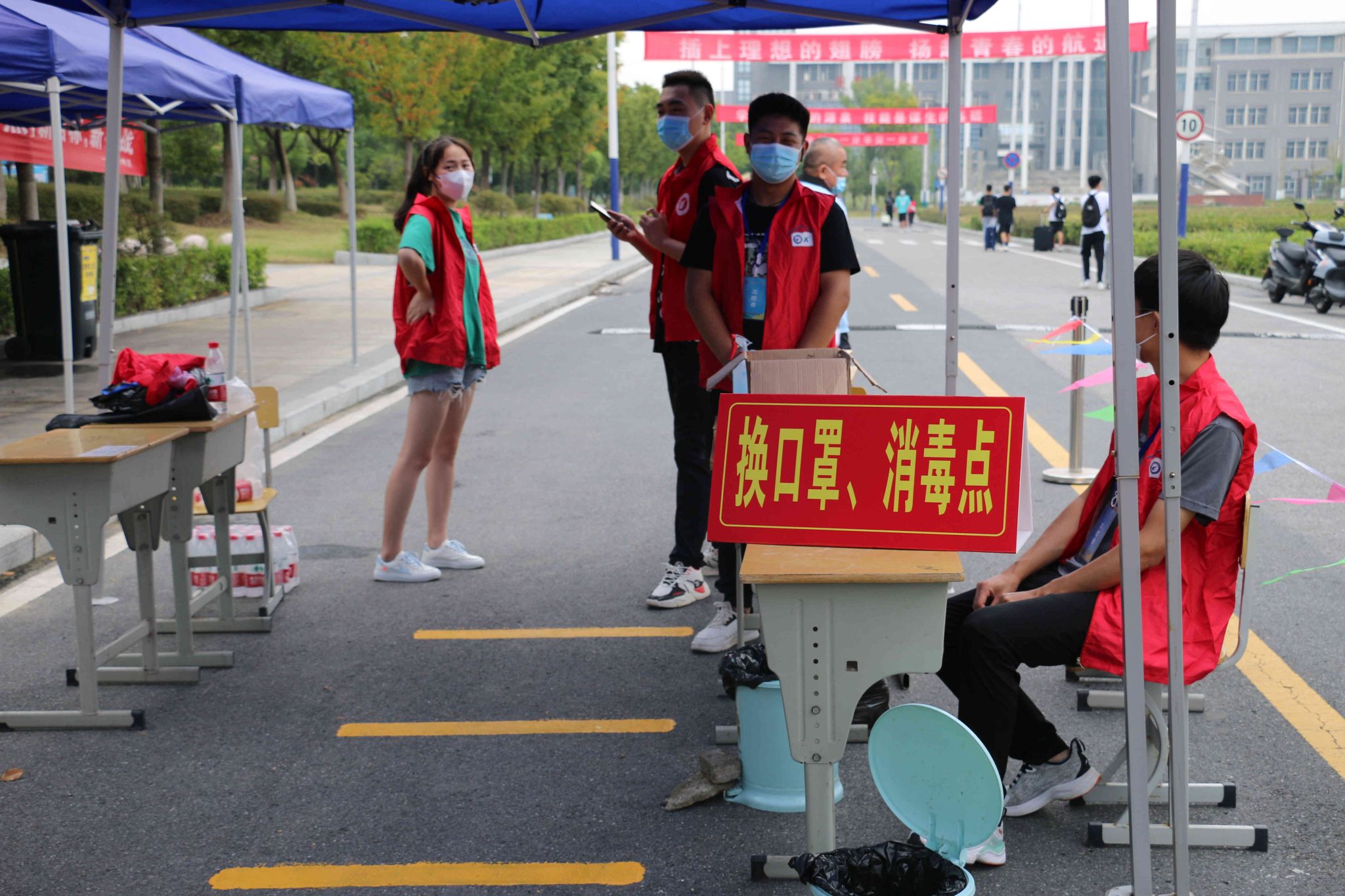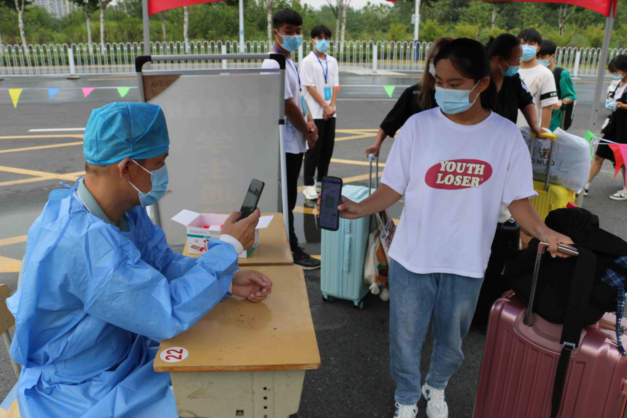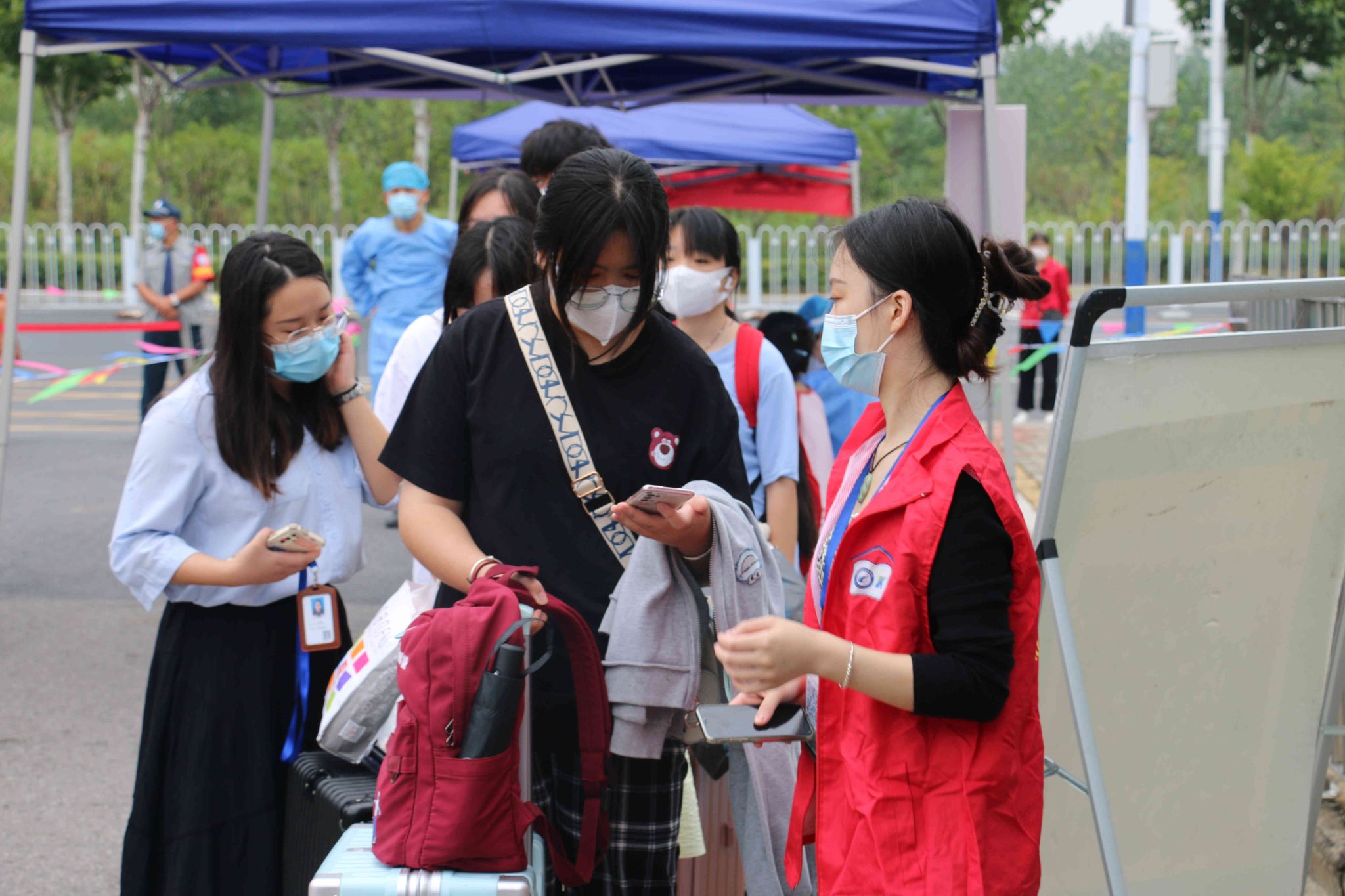 返校时,学生佩戴口罩,持学生证保持间距排队进入校园,依次进行核酸检测、测温、查验健康码、行程码、48小时核酸检测结果、行李消毒、换口罩等环节后,方可进入校园。现场井然有序,学管和学生志愿者们紧密配合。