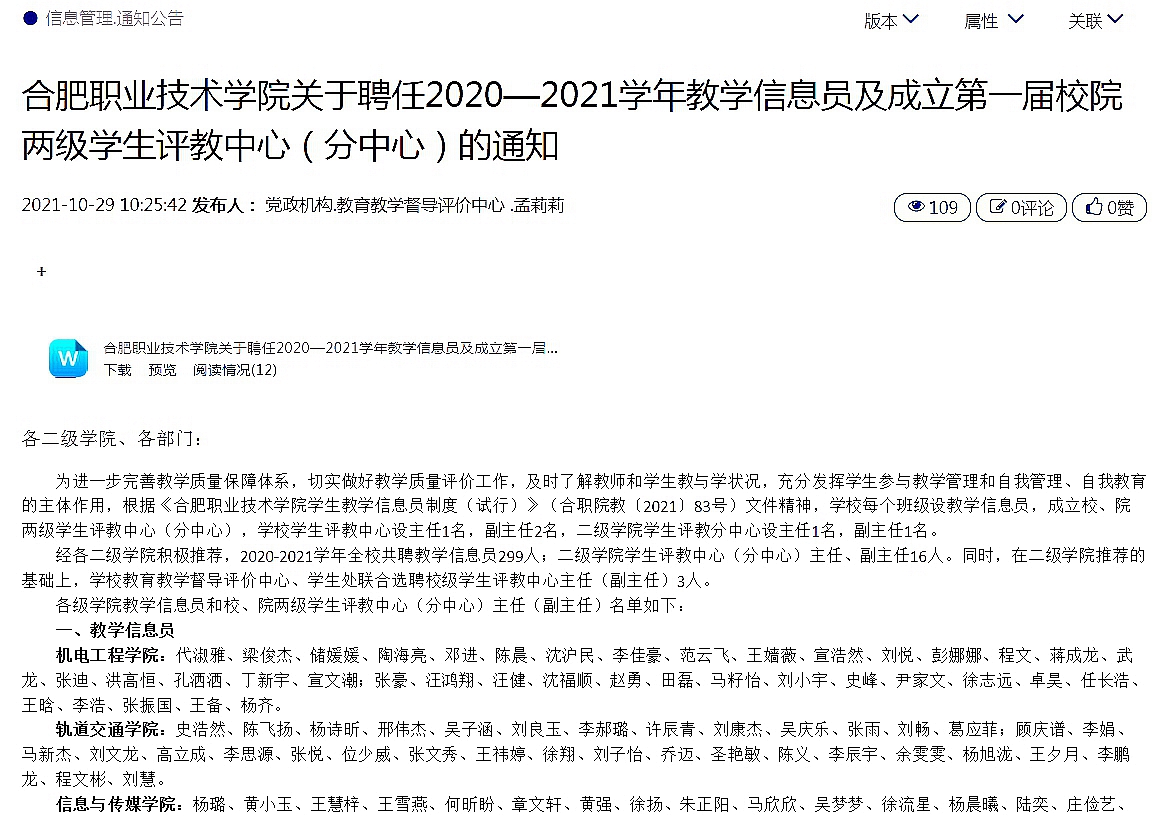 在各二级学院的鼎力支持下,第一届学生评教中心于2021年10月29日正式成立。2021-2022学年全校共聘教学信息员299人,二级学院学生评教分中心主任、副主任16人,校级学生评教中心主任、副主任3人。