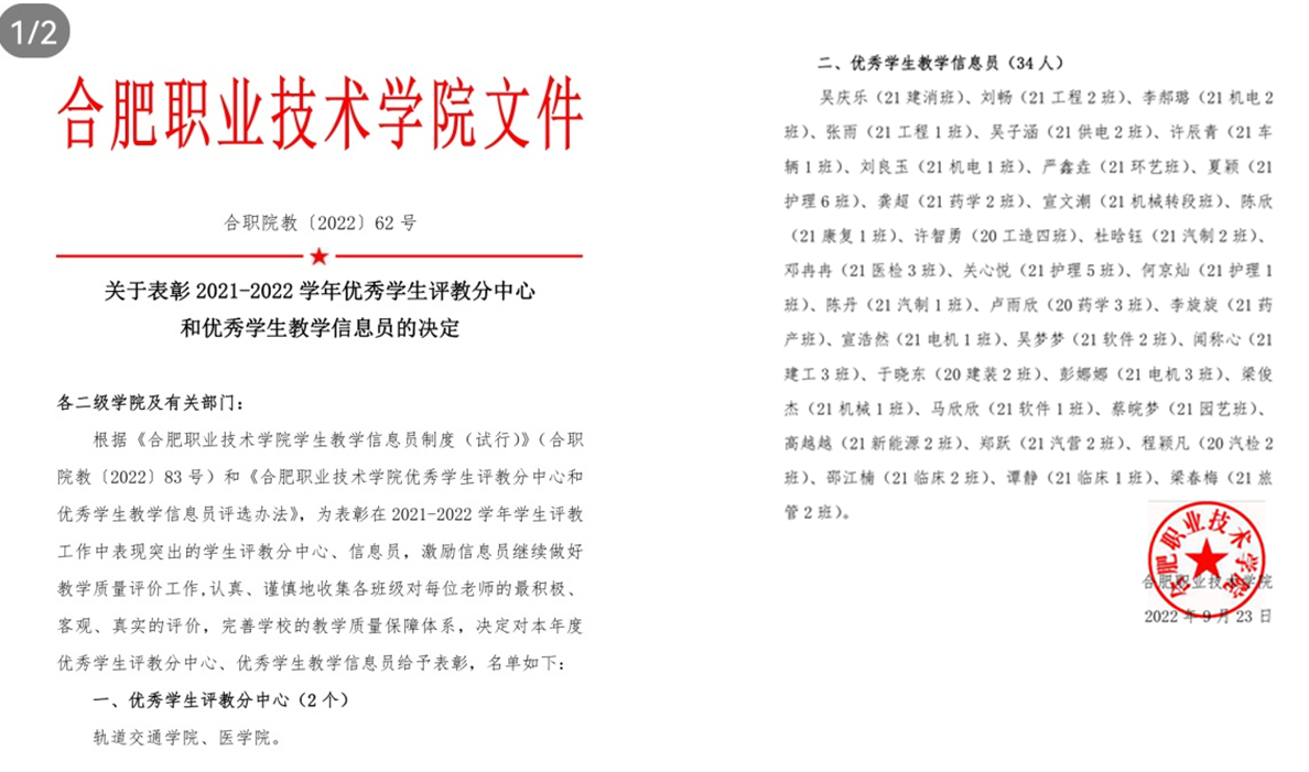 学生评教中心自成立以来,在校领导、学生处、教务处等部门的亲切关怀、各二级学院的大力配合、评教中心全体干部和信息员的勤恳努力下有序地开展并圆满完成了各项工作。根据同学们在评教中心开展的所有工作中的参与度及工作量,由各分中心统计汇总积分、审核,评教中心审核,督导中心审核,二级学院核实学生综合评价情况等,评选出在2021-2022学年学生评教工作中表现突出的“优秀学生评教分中心”“优秀学生信息员”。