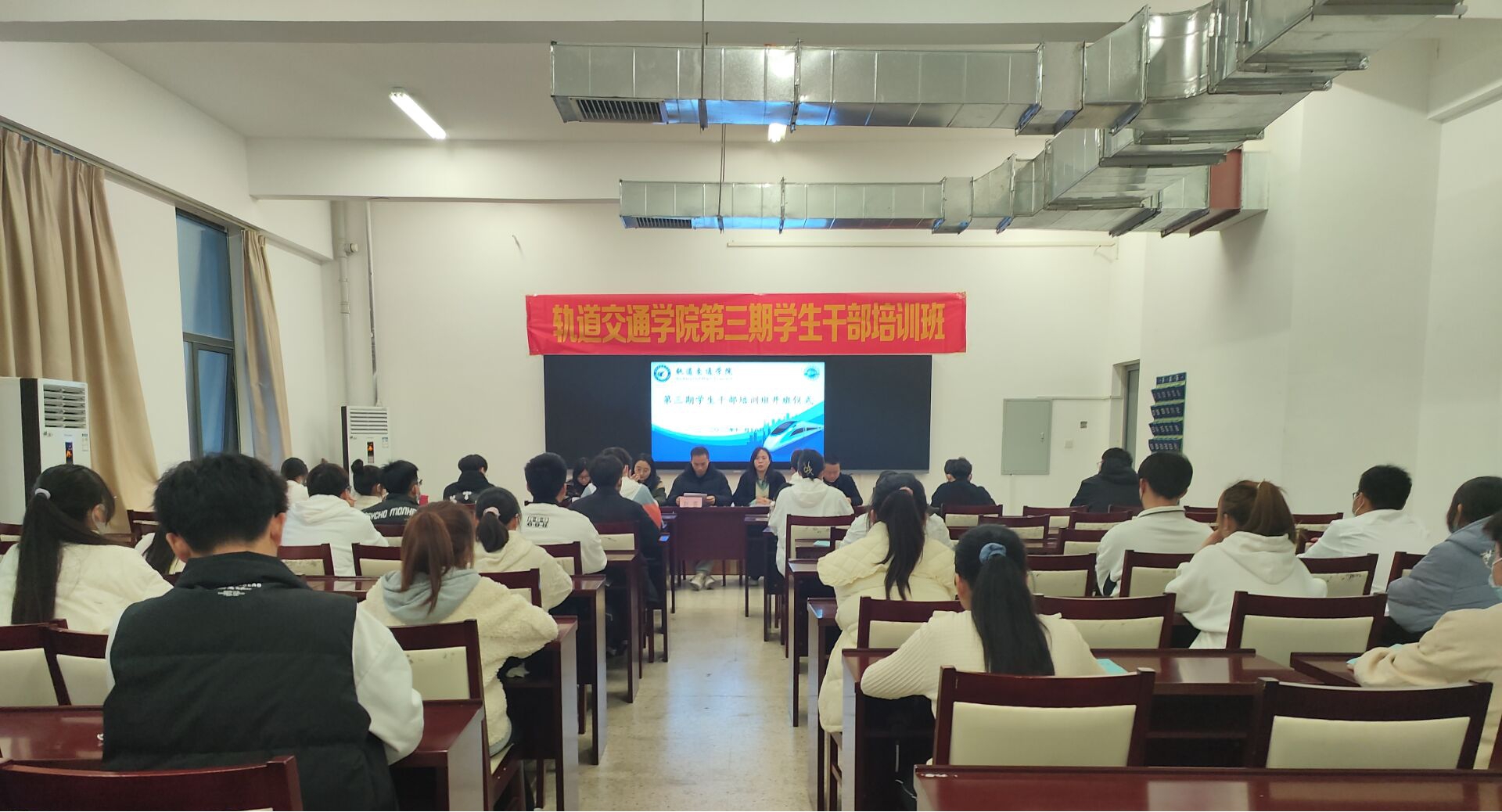 为进一步加强学生干部队伍建设,树立责任意识、团队意识和大局意识,全面提高学生干部的整体素质,11月18日,轨道交通学院2022年学生干部培训班开班仪式,在轨道楼309举行,轨道交通学院学管办主任赵喜,团总支书记吴明丽,全体专职辅导员及40余名学生共同参加。