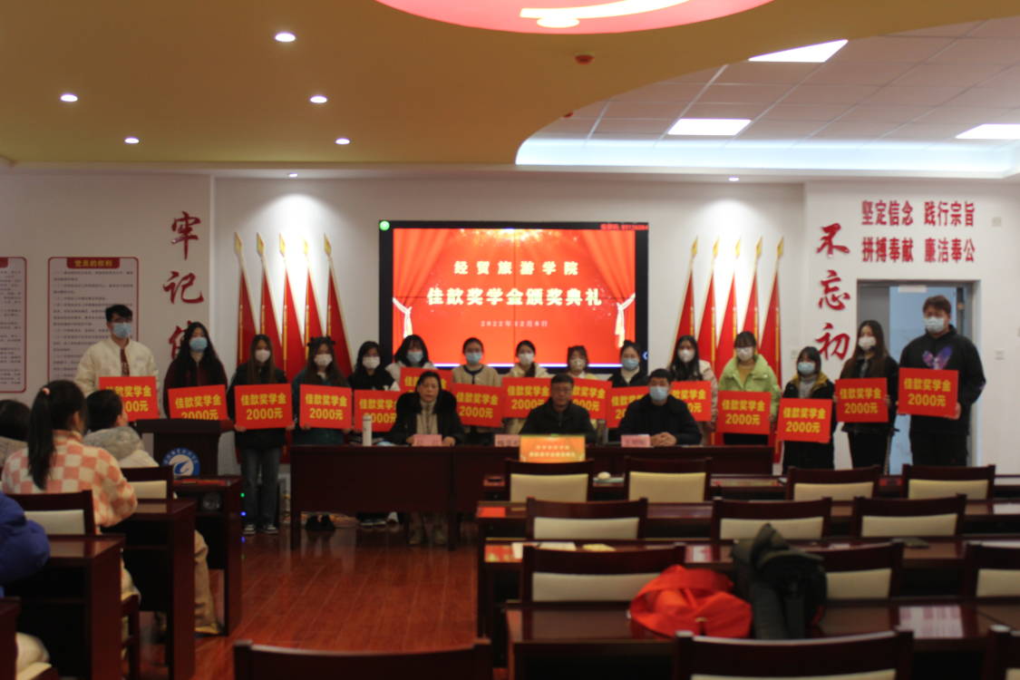 12月8日下午,经贸旅游学院在经贸楼党性体验馆举办2021-2022学年年佳歆奖学金的颁发仪式。经贸旅游学院总支书记梅亚松、院长赵红、学管办主任王明明,学管办翟羽臻、孙紫娟、周燕、刘晓璐等四位老师以及获奖学生和40名学生代表参加了颁奖仪式。