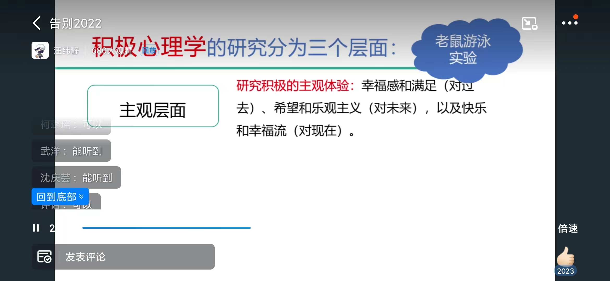 首先,讲座从当前人们的心态出发,通过小游戏、小测试和心理学小实验的方式引导同学们转变看待问题的思路,不仅提高了学生的参与度和积极性,也普及了积极心理学的相关专业知识。接下来,汪老师在线上发起了一个热身活动,让同学们切实地感受到放松的力量。在电影推荐环节,汪老师从心理学视角对经典台词进行分析,阐述梦想的重要性,呼吁同学们设立新年目标。同时,汪老师在讲座中引经据典,以著名诗人苏轼为例,讲述他快乐参与世界的趣闻轶事,以榜样的力量感染同学们。最后,汪老师针对“构建幸福感的日常秩序”以及“如何与抑郁和焦虑情绪相处”分别提出六点建议,帮助同学们更好地度过新形势下的假期生活。