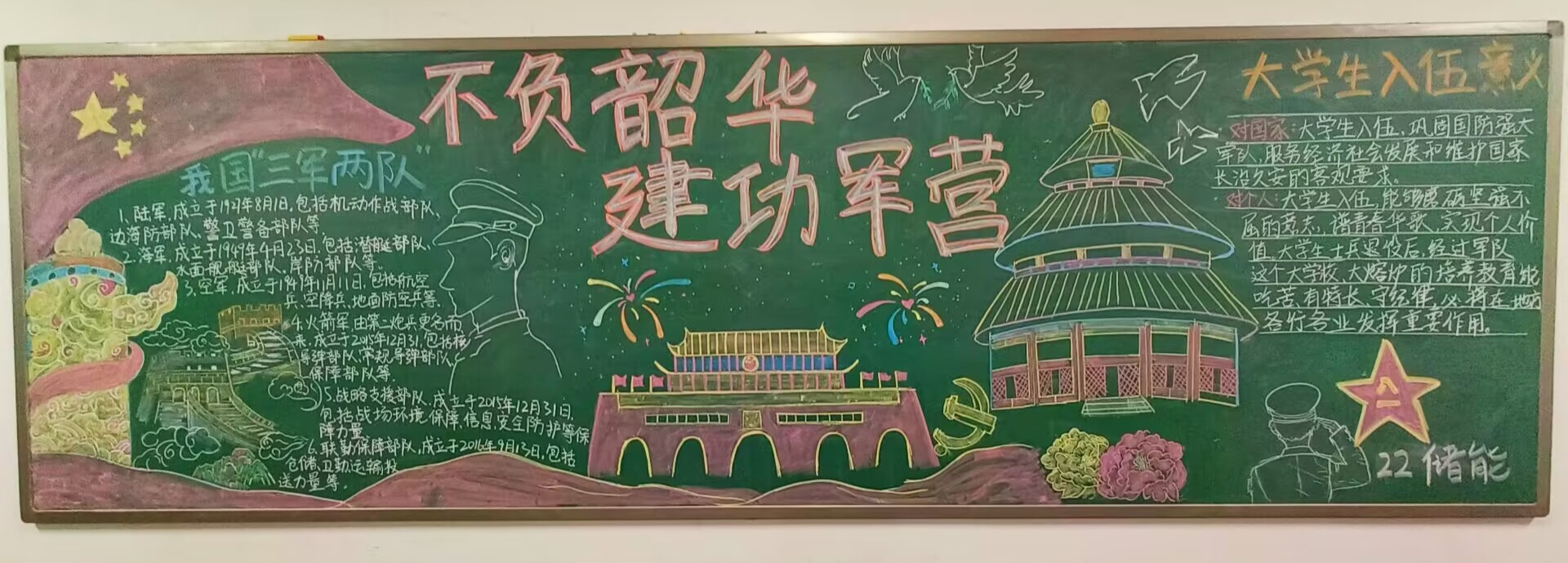 为响应国家号召,激发Beat365大学生参军报国的热情,调动学生报名参军入伍的积极性,树立建设和保卫祖国的志向,机电工程学院于3月3日开展了以“立志报国,踊跃从军”为主题的黑板报评比活动。
