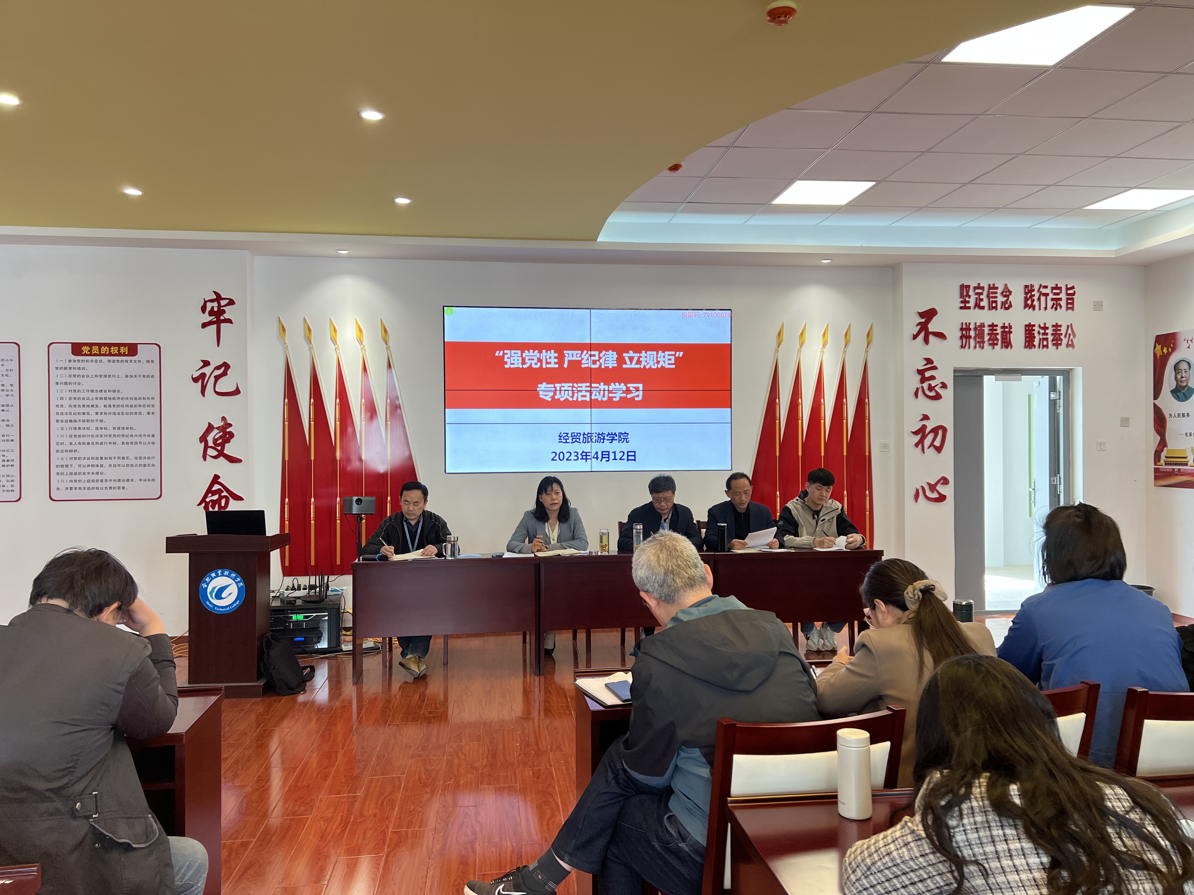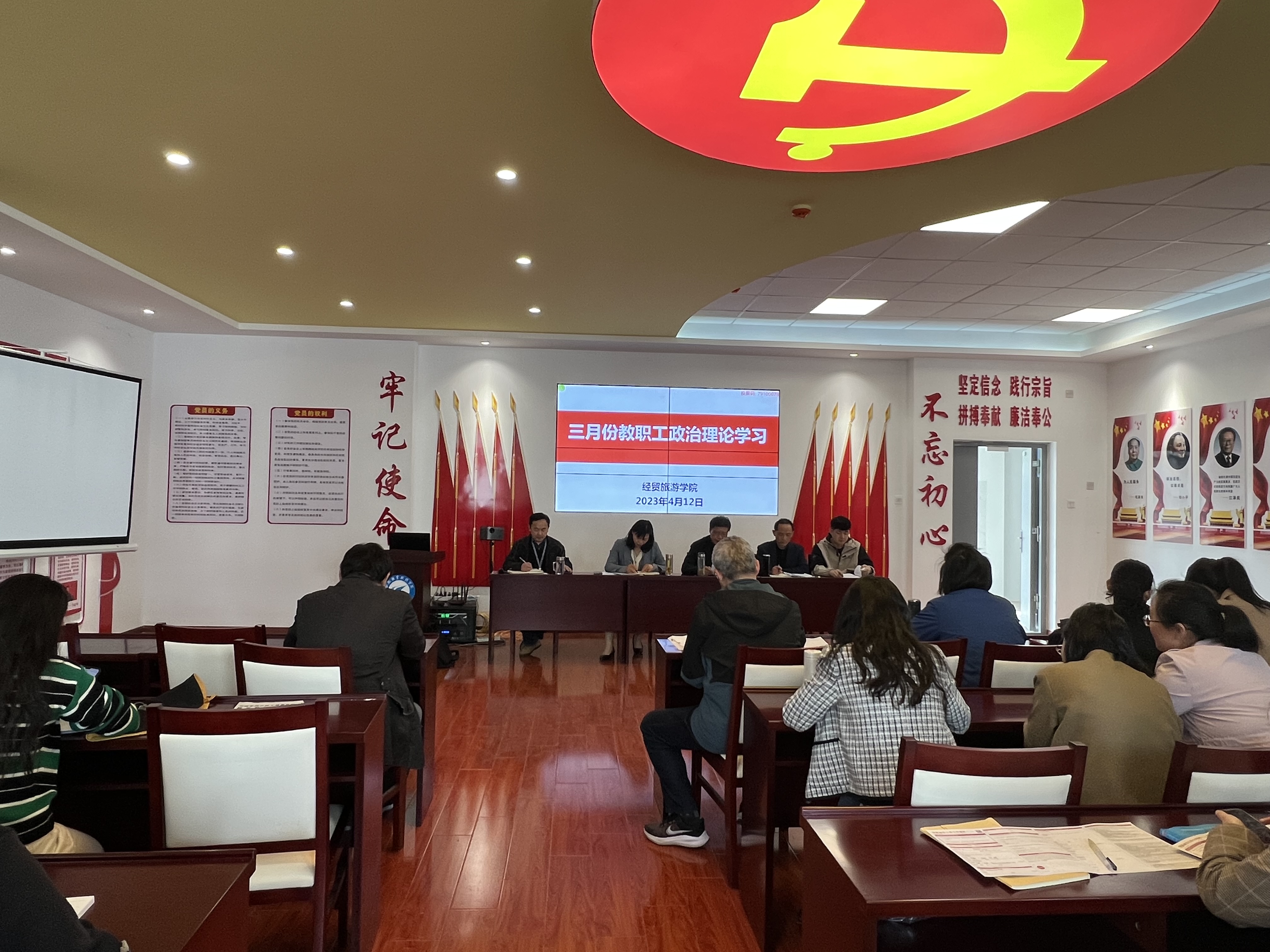 4月12日下午,经贸旅游学院在党性体验馆召开全体教职工政治理论学习会议。学院党政、全体教职工参加会议,会议由副院长陈继林主持。