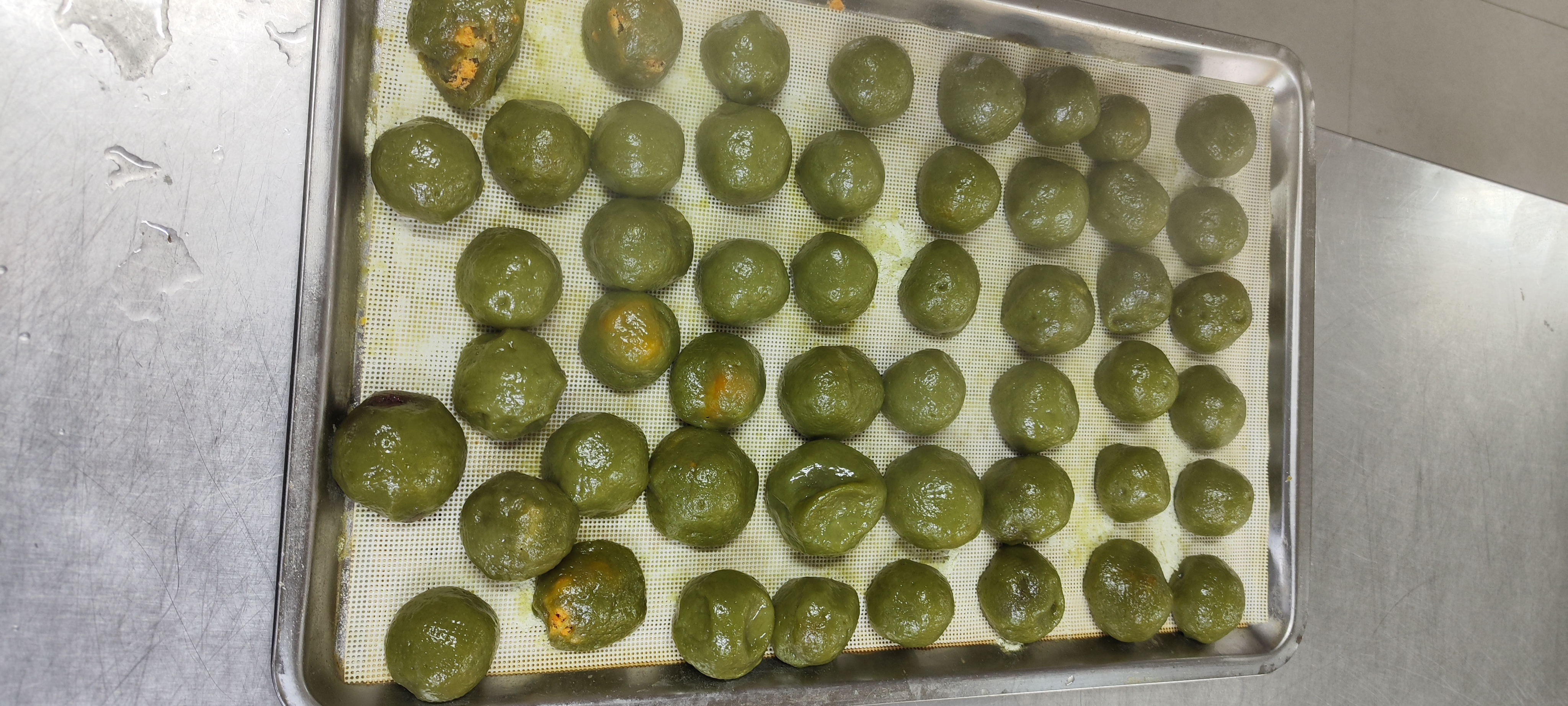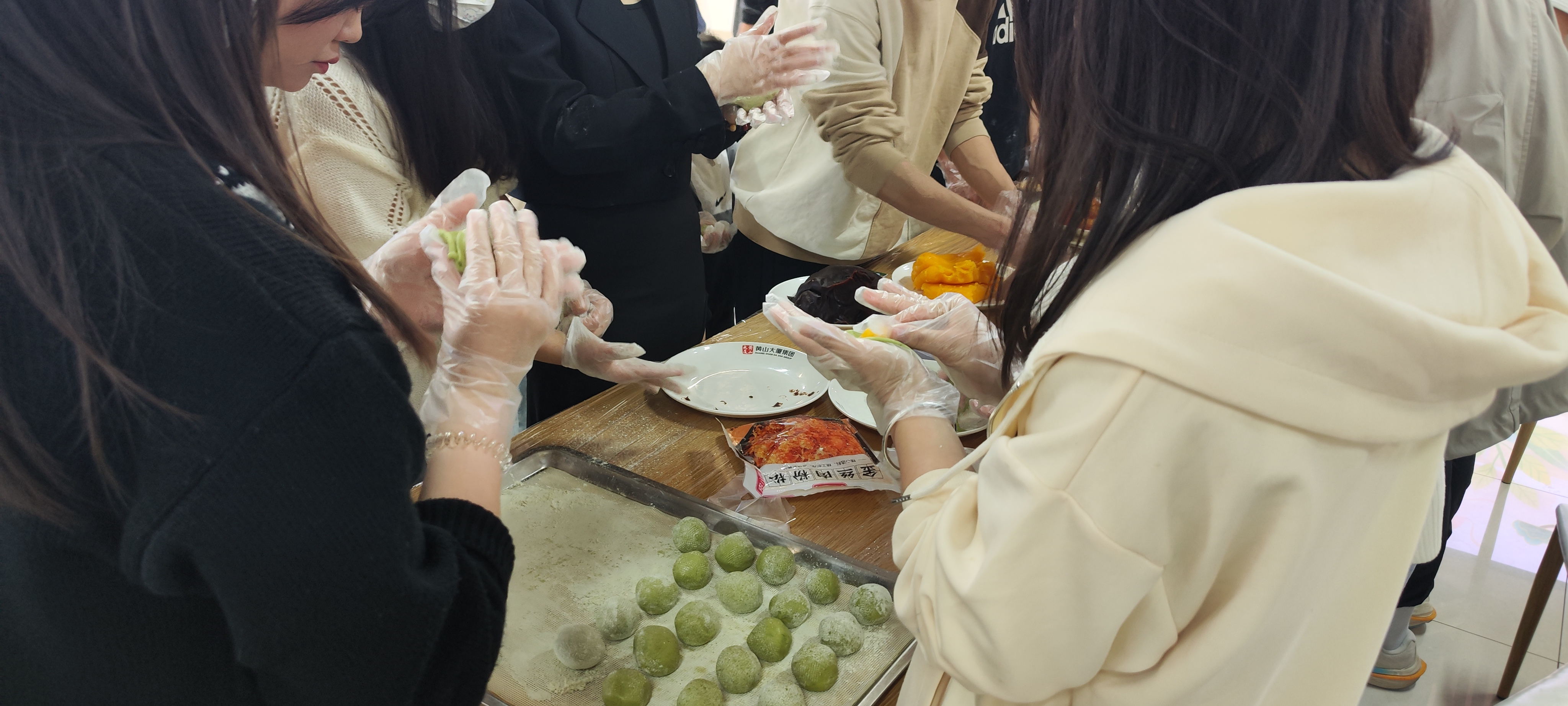 活动一开始,活动志愿者向大家讲解寒食节的来历后,便将制作青团的材料摆上桌,接着由专业师傅展示青团制作过程。正如清代美食家袁枚在《随园食单》中那般描写“捣青草为汁,和粉作团,色如碧玉”。待注意事项尽数知悉,现场气氛立刻活跃了起来,大家纷纷撸起袖子,揉面团、加面粉、拌馅料、包团子……青团中可包馅料有四种,分别是豆沙馅、奶黄馅、肉松馅以及咸蛋黄馅,同学们可以根据自己喜好自由添加。虽然大多数同学都是第一次制作青团,动作不太娴熟,但通过彼此交流和专业师傅的指导,最终大家都成功揉出了一个个青翠诱人的青团。