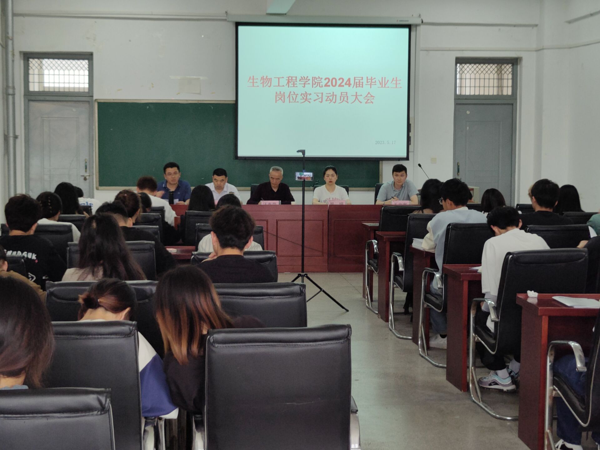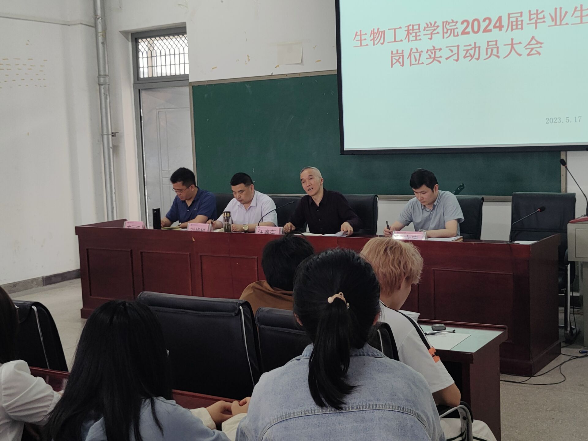 根据教学计划安排,为做好2024届毕业生的岗位实习工作,同时推进大学生实习“扬帆计划”,生物工程学院于5月17日下午在生化楼A305召开2024届毕业生岗位实习动员大会。此次会议采用线上线下结合的方式进行,会议由学院党总支书记汪春荣主持,到现场参会的有学院院长刘修树、党总支副书记周婷、副院长方丽波、王文宇,各实习点组长及各班班长学委,其他未到现场的2024届岗位实习生通过钉钉线上观看。
