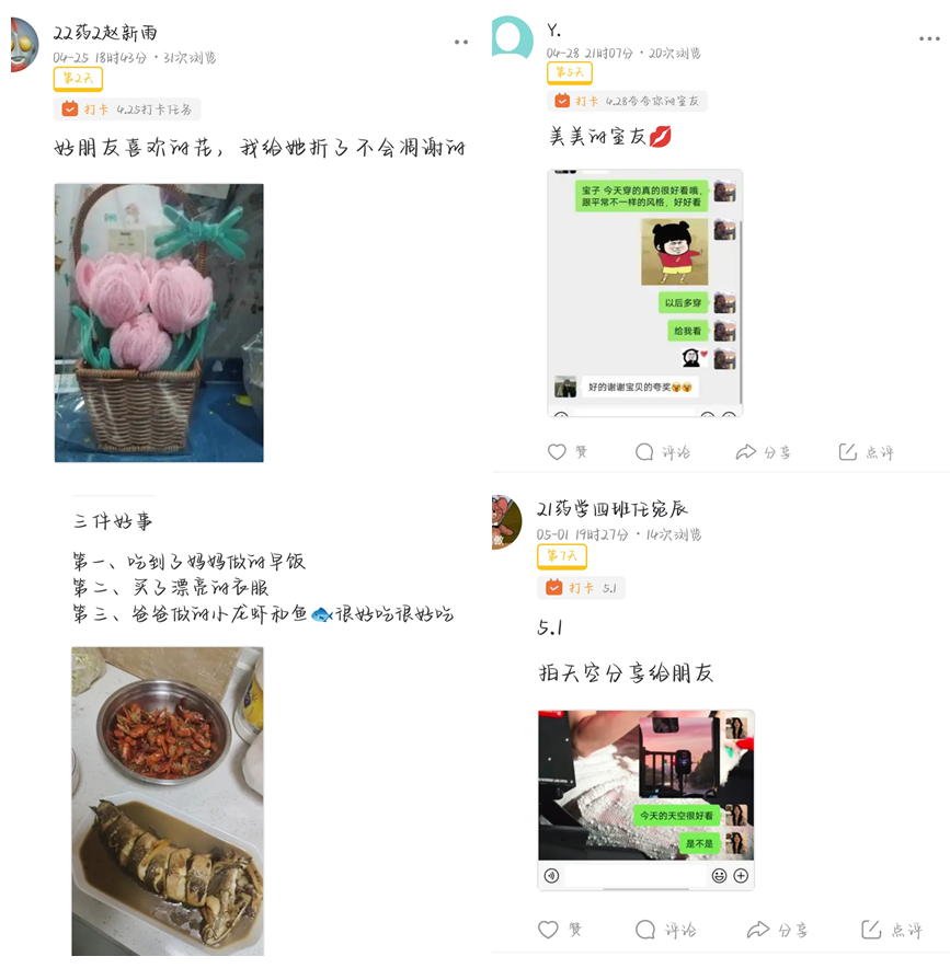 打卡活动在“合职院生物工程学院”公众号上一经发布,就得到了21级和22级学生的广泛关注。活动伊始,共有118名同学报名参加。依托微信小程序“小打卡”让同学们在指定圈子里发布每日打卡照片,最后完成6日、12日、18日、24日连续打卡的分别有86、79、63、21名同学。打卡任务分为“好友”“家人”“日常”“学习”等模块,比如“给自己最好的朋友打个电话”“夸夸你的室友”“为同学做件小事”等任务加强了同学们之间的联系,使他们在完成任务的过程中体会到沟通和助人的乐趣。发布“给家人写封信”“为妈妈做张贺卡”等任务让同学们解锁与亲人在一起的回忆,激活感恩的情绪。“拍摄一张今天的天空”“去操场看看日落吧”等任务让同学们享受当下的美好,释放压力。在最后的总结暨分享大会上,同学们踊跃地分享自己印象中最深刻的趣事,他们还表示在任务中不仅收获了朋友家人的关心,也让自己的生活变得更加有序。