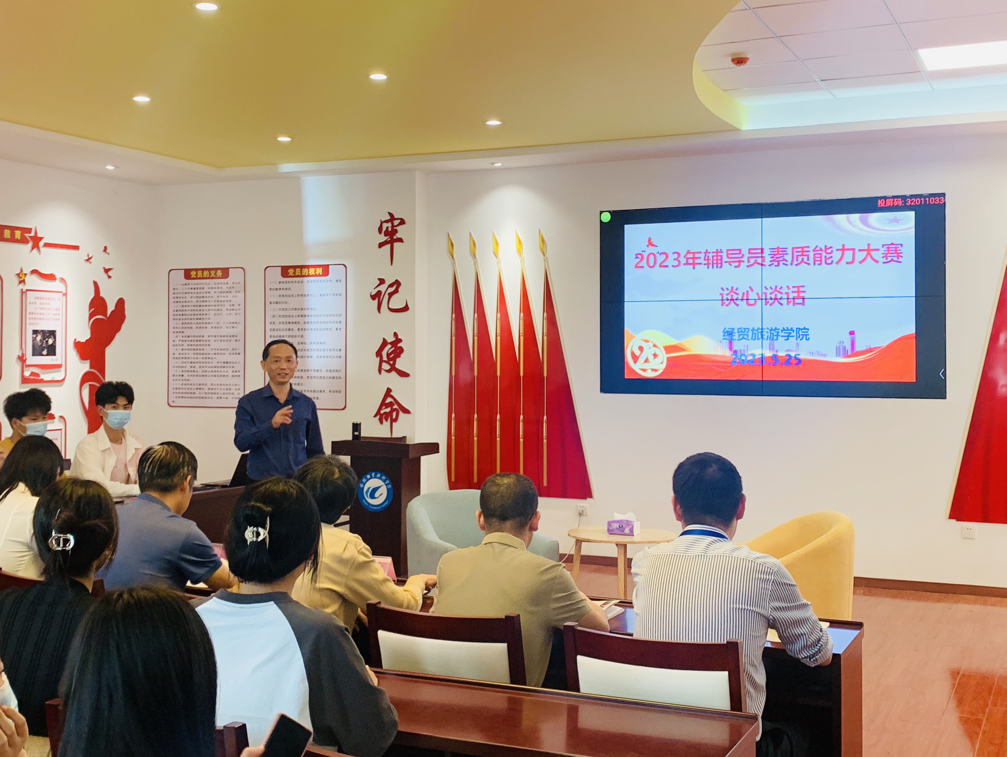 本次大赛由学院学管办组织实施,共有9名专职辅导员参赛,前期在开展理论知识测试笔试的工作基础之上,决赛主要考察辅导员“谈心谈话”这一环节的业务能力素养。“谈心谈话”主要考察辅导员对相关理论政策、学生特征、学生成长成才规律的了解及对问题的解决能力和教育引导能力。本次大赛的赛题紧密结合学院学生实际,涵盖学生日常容易出现的问题:学生入党、学生资助、学习适应、宿舍生活、课堂教学、心理问题等。参赛选手在比赛中充分发挥出自身出色的业务能力和职业素养,帮助学生解决实际困难,达到了良好的效果。