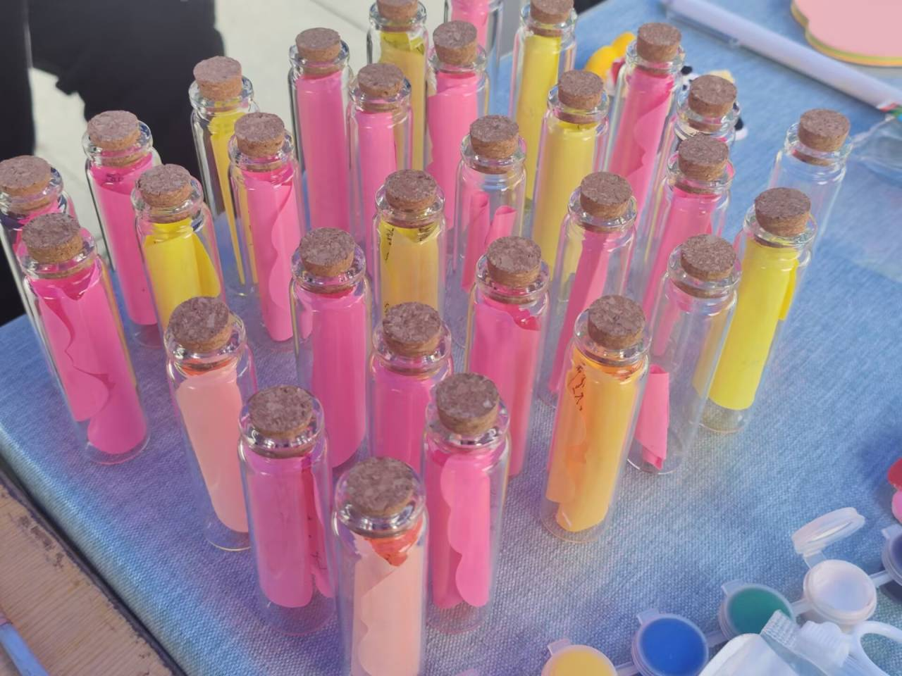 游园会由3个小活动组成,包括“拯救情绪大作战”“心情涂鸦”和“心声漂流瓶”。志愿者就位以后,游园会正式开始。“拯救情绪大作战”通过套中写有情绪词的障碍物来获取表演机会,并获得奖品。套圈以它独特的魅力吸引了来往同学的目光,越来越多的同学加入进来,只见他们纷纷瞄准目标,为了心仪的奖品投出手中的一圈。活动现场的氛围迅速火热起来。“心情涂鸦”广受女生们的青睐,同时也吸引了其他学院的同学参加。挑好自己想涂的石膏娃娃,调制自己喜欢的颜色,就可以开始自由创作了。同学们在上色的过程中放松了心情,在专注中“涂”到了快乐。“心声漂流瓶”旨在鼓励同学们将自己的烦恼写下来放入漂流瓶中,其他同学也可以随机挑选一个瓶子进行回复,帮助他人纾解忧愁,在助人的过程中体验积极的情绪。