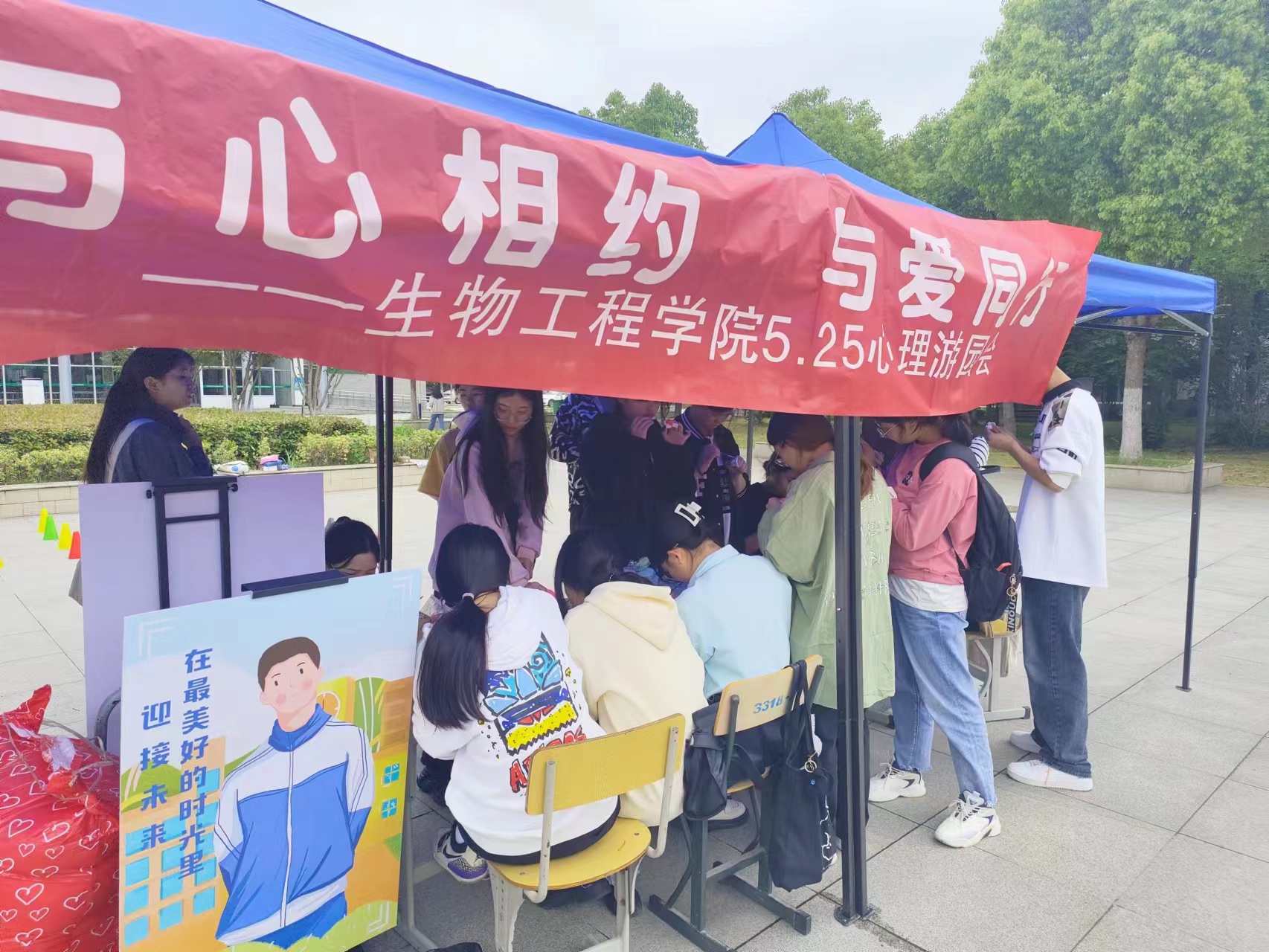 为进一步提升学生的心理幸福感,增强在校学子的心理健康意识和心理调适能力,5月24日下午,生物工程学院二级辅导站开展了“与心相约 与爱同行”5.25心理游园会活动。本次活动在鼓山校区一食堂对面广场举办,面向全体在校学生。