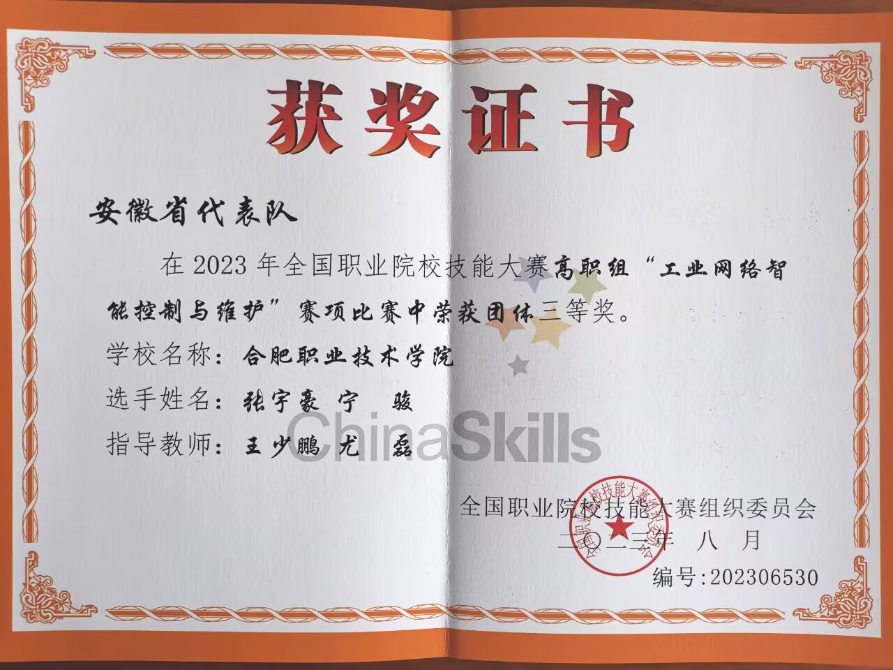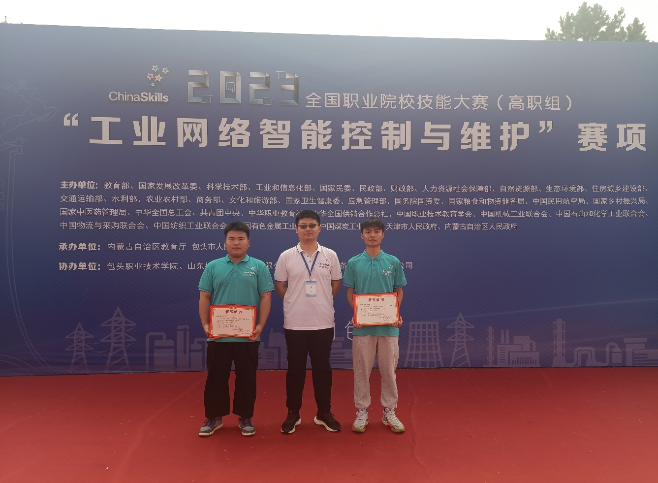 2023年全国职业院校技能大赛高职组新增赛项“工业网络智能控制与维护”已于8月15日至16日在包头职业技术学院圆满举行。我院张宇豪、宁骏两位选手发挥出色,荣获团体三等奖 。